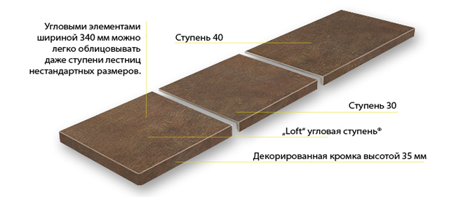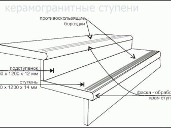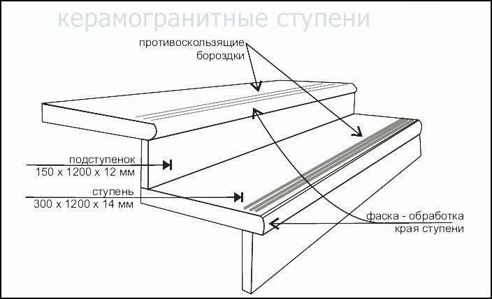 Zum Beispiel werden die Parameter von 1200 × 300 × 10 mm als optimale Größen von Feinsteinzeug für Stufen betrachtet. Derzeit gibt es jedoch keine Norm für die Veredelung von Keramikfliesen. Seine Größe hängt von der Höhe und Breite der Stufen ab, so dass Sie nur über die ungefähren Parameter sprechen können, die von 25 bis 35 cm variieren.