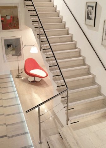 Das beliebteste universelle Material für die Stufenbearbeitung ist Feinsteinzeug. Es sieht nicht nur in jedem Interieur harmonisch aus, sondern kann auch viele Jahre lang dienen, ohne seine eigenen Eigenschaften zu verlieren. Bei den Registrierungsschritten wurden Produkte mit reliefierter oder nicht polierter (glasierter) Oberfläche verwendet. Feinsteinzeug für Treppen kann monolithisch, komplett oder vorgefertigt sein.Es sollte beachtet werden, dass monolithische Stufen viel eindrucksvoller aussehen als ihre Gegenstücke, sie werden normalerweise für Innentreppen verwendet.