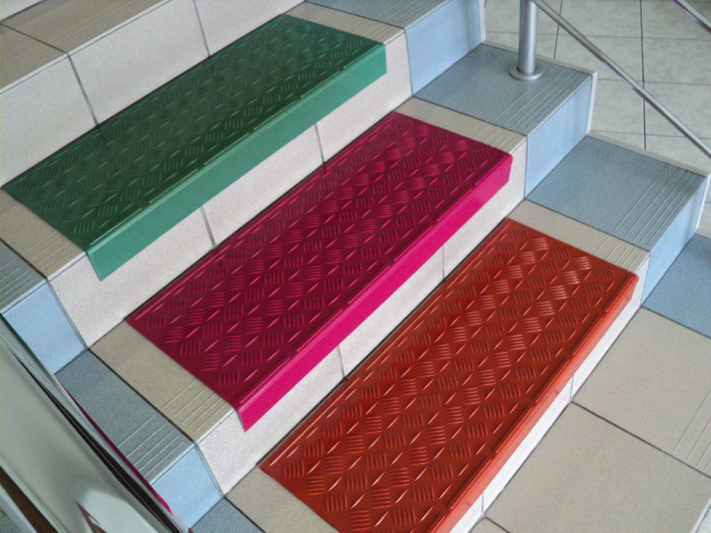 Für Treppen mit hohem Verkehrsaufkommen besser Gummikacheln kaufen. Seine ästhetischen Eigenschaften können nicht mit früheren Kopien konkurrieren, aber es ist extrem haltbar und langlebig. Dies ist eine Option für diejenigen, die vor allem Qualität und Funktionalität schätzen und für die die dekorativen Eigenschaften des Futters keine Rolle spielen. Antirutschbeläge aus Gummi werden oft zur Dekoration von Treppen in Vorschul- und Schuleinrichtungen, städtischen Gebäuden und medizinischen Komplexen verwendet.