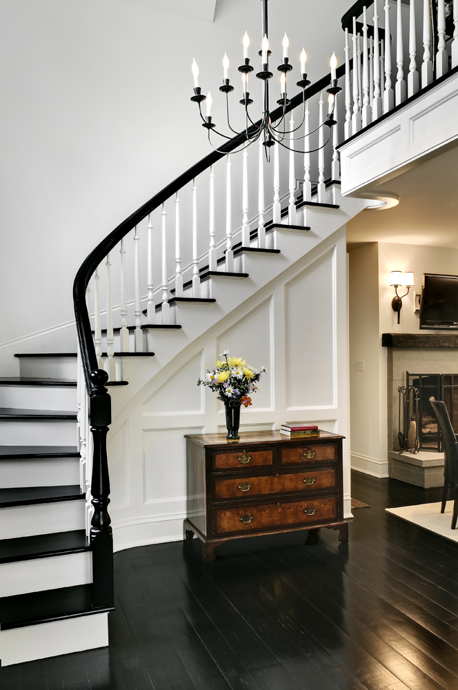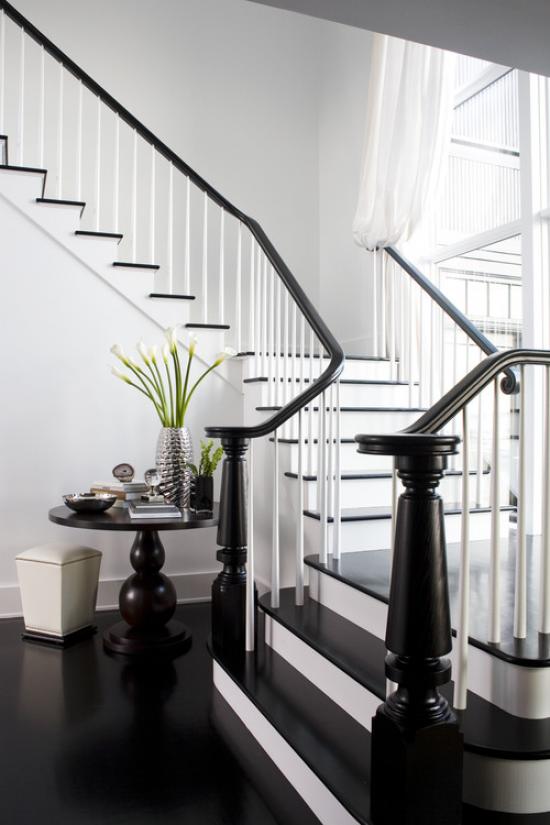 Die Treppe, die gleichzeitig mit dunkler und heller Keramik dekoriert ist, wird zu einer echten Dekoration eines Landhauses. Besonders schön werden Designs mit Glaselementen aussehen, umrahmt von stilvollen Geländern.