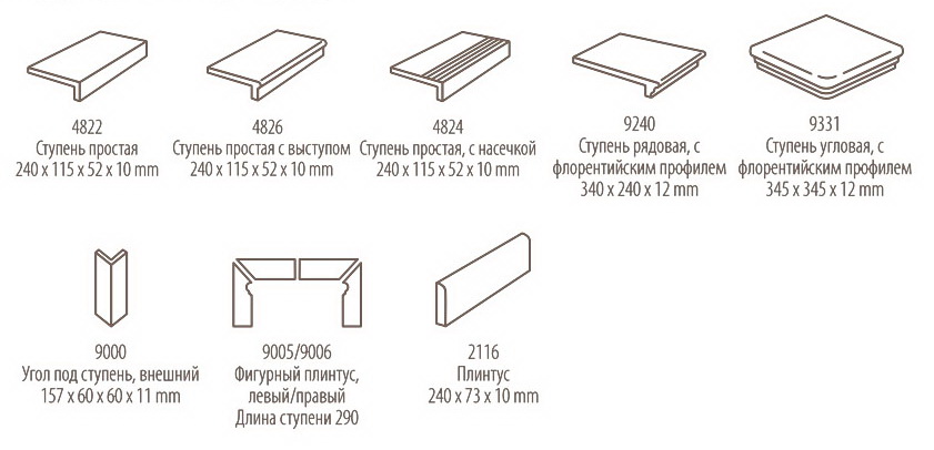 Der Führer in diesem Bereich wird betrachtet Firma Ströcher. Die Palette der Stufen wird in den folgenden Modifikationen vorgestellt: konvexe und rechteckige Produkte, florentinische Produkte, Elemente mit Kerben. Die Farbe der Fliese variiert von braunen bis zu dunklen Grautönen. Die Produkte zeichnen sich durch Rutschhemmung aus, weshalb sie häufig im Hof- und Außenbereich eingesetzt werden.