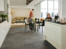 PVC-Fliesen (Polyvinylchlorid) - Budget-Option Fliesenboden. Es enthält Holzmehl oder Talkum (den Hauptfüllstoff), einen Weichmacher und Polyvinylchlorid. Die Vorteile einer solchen Ausrüstung sind nicht nur ökonomisch, sondern auch, dass sie praktisch keinen chemischen Einflüssen ausgesetzt sind und wasserdicht sind.