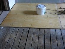 - Die "schnelle Version" des Estrichs ist eine einfache Befestigung von feuchtigkeitsbeständigen Gipsplatten mit einem speziellen Kleber (Zweikomponenten-Polyurethan). Der Klebstoff ist so elastisch, dass die Bewegung des Holzes seine Integrität nicht zerstört. Es ist zulässig, die GVL-Platte in zwei Schichten zu legen, um der Basis zusätzliche Festigkeit zu verleihen, und es muss sichergestellt werden, dass die Nähte der ersten und zweiten Schicht nicht zusammenfallen.