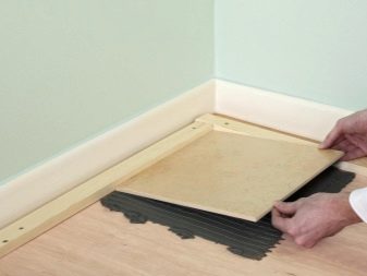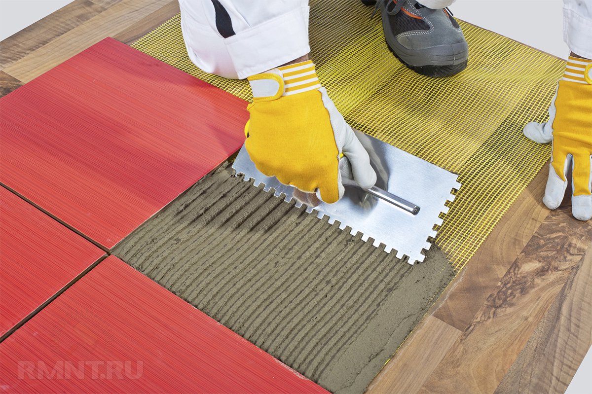 Sobald die Ausrichtungsbleche installiert sind, sollte die Beschichtung entlang der Nähte geschliffen werden. Wenn die Fugen zwischen den Sperrholzplatten mehr als 3 mm betragen, sollten Sie die Schlitze vorsichtig mit Silikondichtmittel füllen. Vergessen Sie nicht, die Sperrholzplatten mit Primer zu sättigen.kompatibel mit Spezialkleber. Nach dem Imprägnieren kann Klebstoff auf die Fliese aufgebracht werden (ein Zweikomponenten-Polyurethan ist geeignet).