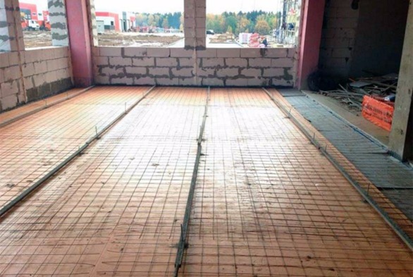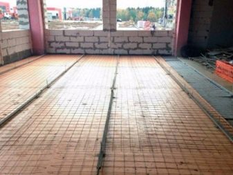Nach dem Verlegen von Abdichtungsmaterial kann verstärkt werden, was dem Boden eine größere Zuverlässigkeit im Betrieb verleiht. Dazu müssen Sie alle Armaturen kaufen. Die beste Option wäre eine verstärkte Masche Ø10mm - Ø12mm, und oben kann man ein Netz legen. Stützen Sie 2-3 cm unter den Stäben (sie können aus Plastikröhrchen bestehen), so dass die Armierung das Isoliermaterial nicht direkt berührt.
