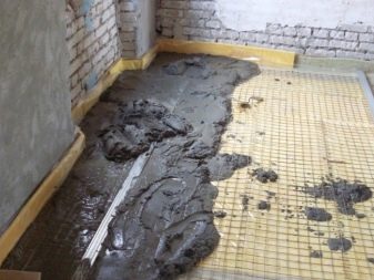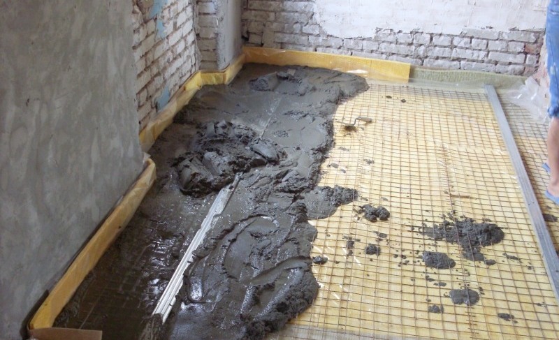 Es ist am gebräuchlichsten, da es gleichzeitig ermöglicht, einen Entwurfsboden vorzubereiten, der für die Verlegung von Fliesen aus verschiedenen feuchtigkeitsbeständigen Materialien geeignet ist.