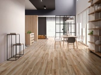 Der Bodenbelag im Raum sollte mit dem allgemeinen Innenraum kombiniert werden. Bodenfliesen unter der Diele erfüllen dieses Kriterium voll und ganz. Aufgrund seiner Erscheinung passt es perfekt in die Räume verschiedener Stile. Zum Beispiel eignet sich schwarze Fliese für einen modernen Stil für eine klassische Holzfliese - für eine klassische - Nuss- oder Mahagonifliese, für einen Öko-Stil - für jeden Bodenbelag für Parkett.
