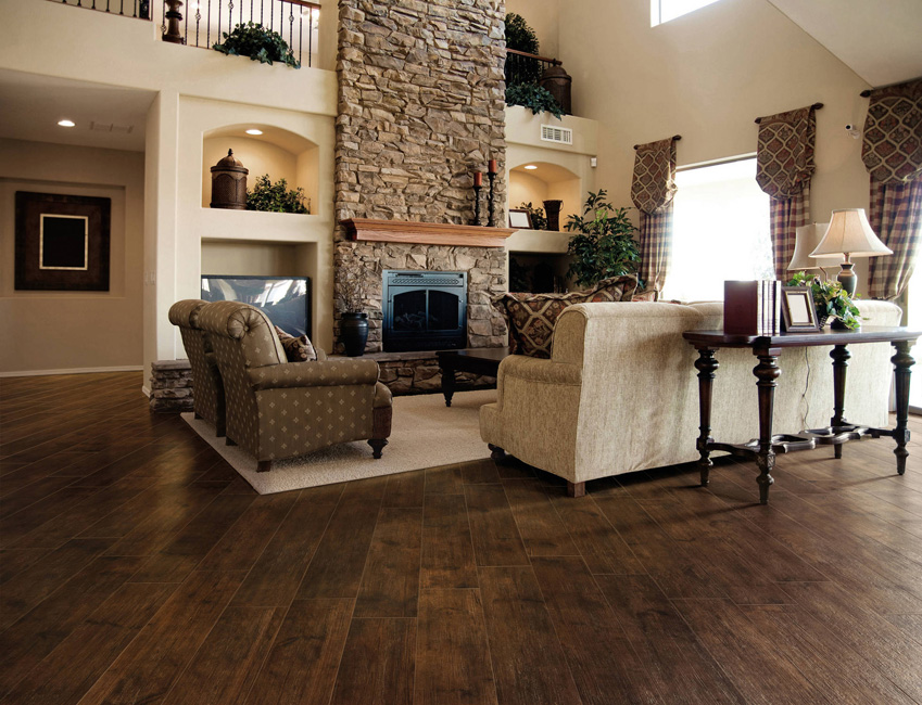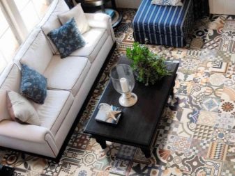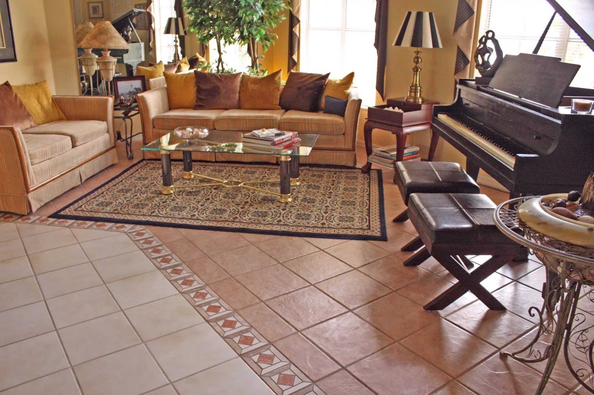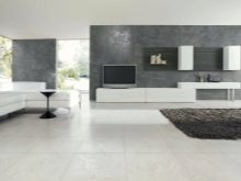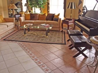 Fliese für das Wohnzimmer kann in Verbindung mit dem Teppich gewählt werden. Diese Option ist relevant für Landhäuser und das System "Warm floor".Für das Wohnzimmer sind Fliesen sehr gut geeignet für Holz oder Stein.