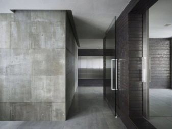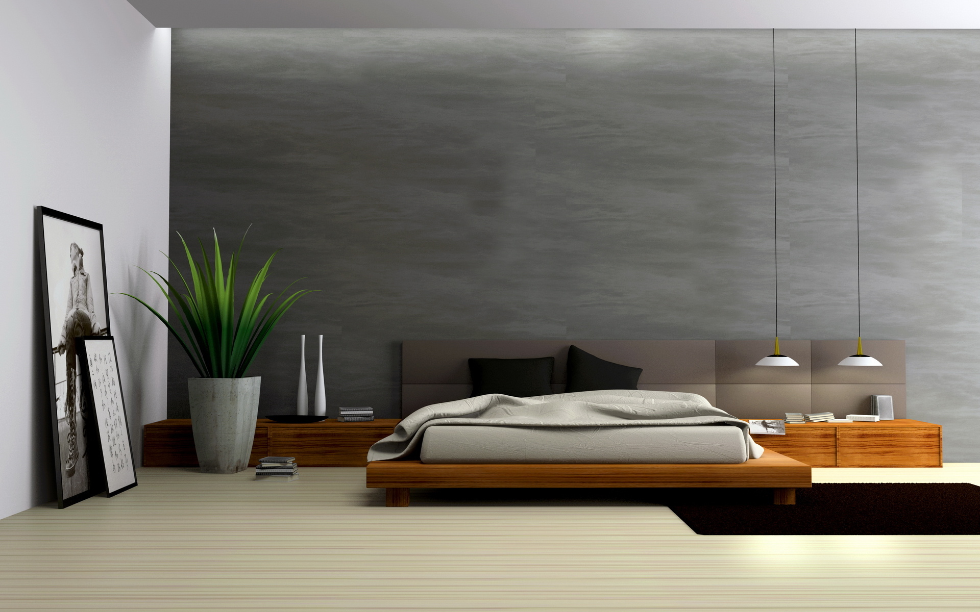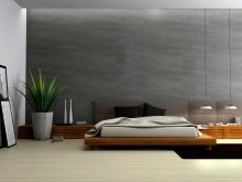 Für minimalistisches Design ist die Oberfläche für hellgraue Zemente mit Beizen geeignet. Auf einem grauen Hintergrund können Sie ein modernes Bett installieren und LED-Lampen verwenden.