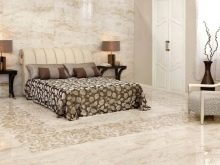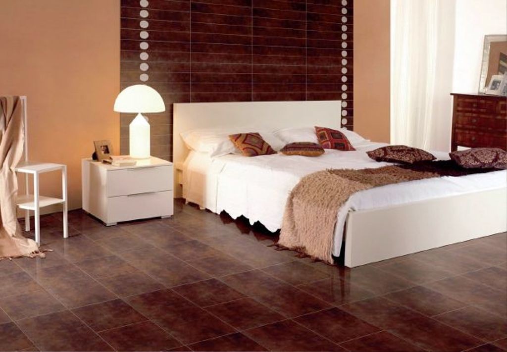 Ein Schlafzimmer ist ein Raum, in dem Fliesen selten verwendet werden, aber in Kombination mit Gummimatten kann die Oberfläche von Porzellan sehr praktisch sein, weil der Boden leicht zu reinigen ist.