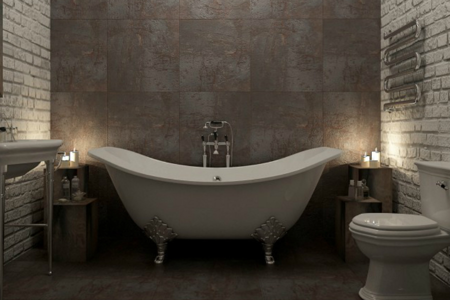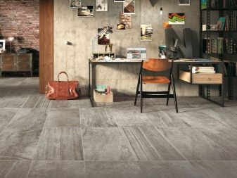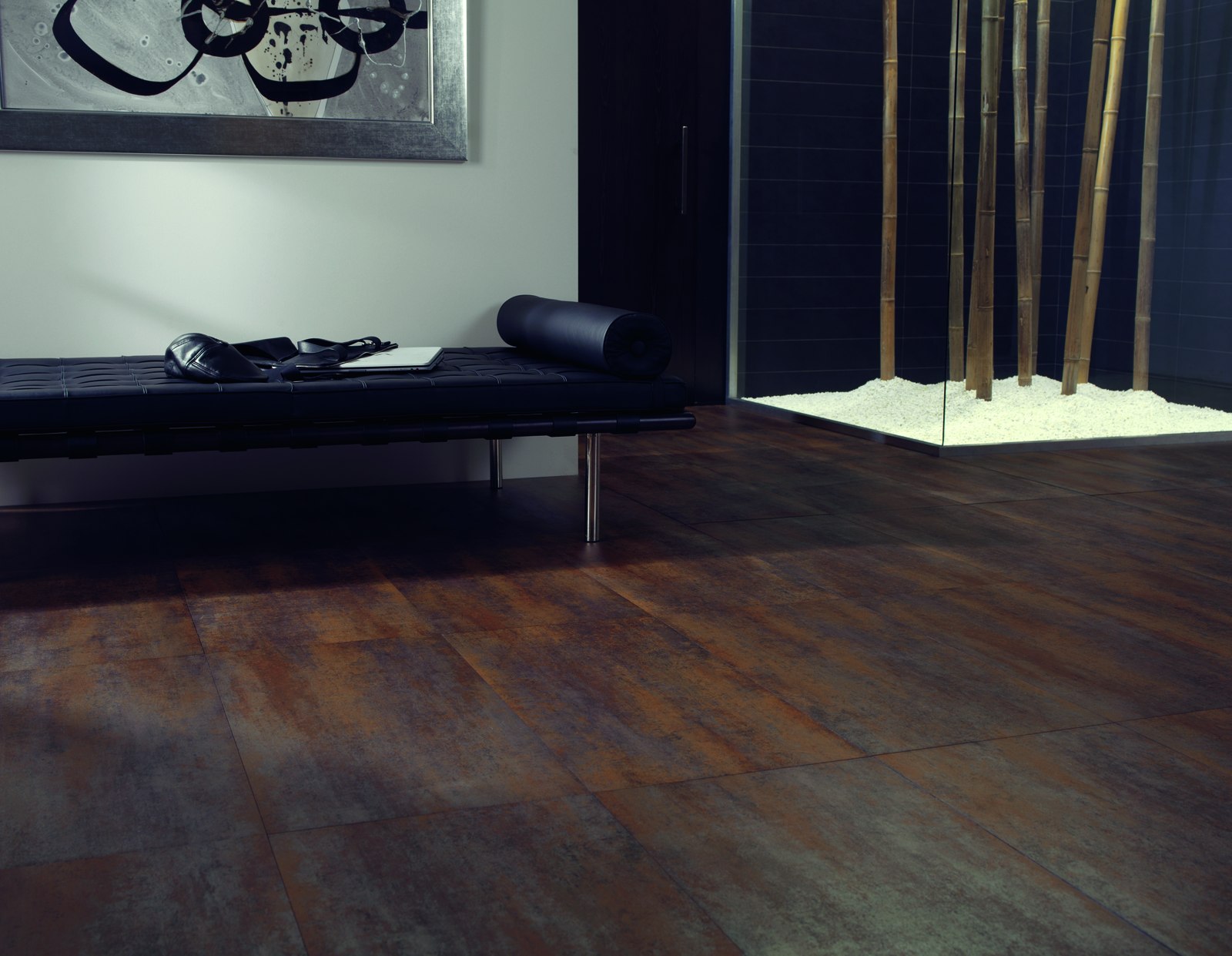 Keramikfliesen mit Nachahmung von rostigem Metall - eine mutige Innenlösung. Dieser Boden passt gut zu Leder Osmanen und Komposition in einem Metallrahmen. In einem solchen Design erscheinen Expressionismus-Stilelemente.