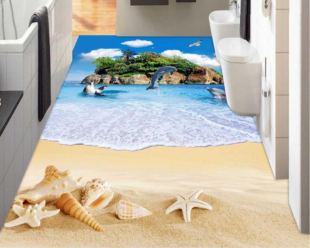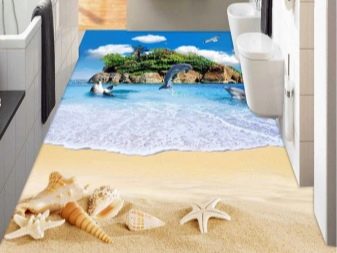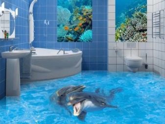Eine der schönsten und originellsten Lösungen für solche Räumlichkeiten ist eine Kachel mit einem 3D-Bild, die das Gefühl eines dreidimensionalen Bildes vermittelt. Der Boden muss in Harmonie mit den Wänden sein.