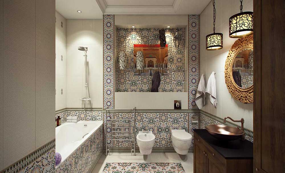 Die Fliese mit einer Verzierung wird ein reich verziertes Badezimmer hervorheben. Kleine Muster auf den Fliesen sind mit kunstvollen Linien von Lampen kombiniert. Marokkanischer Stil entsteht gerade aufgrund komplexer Ornamente.