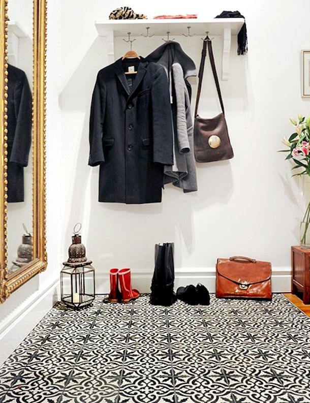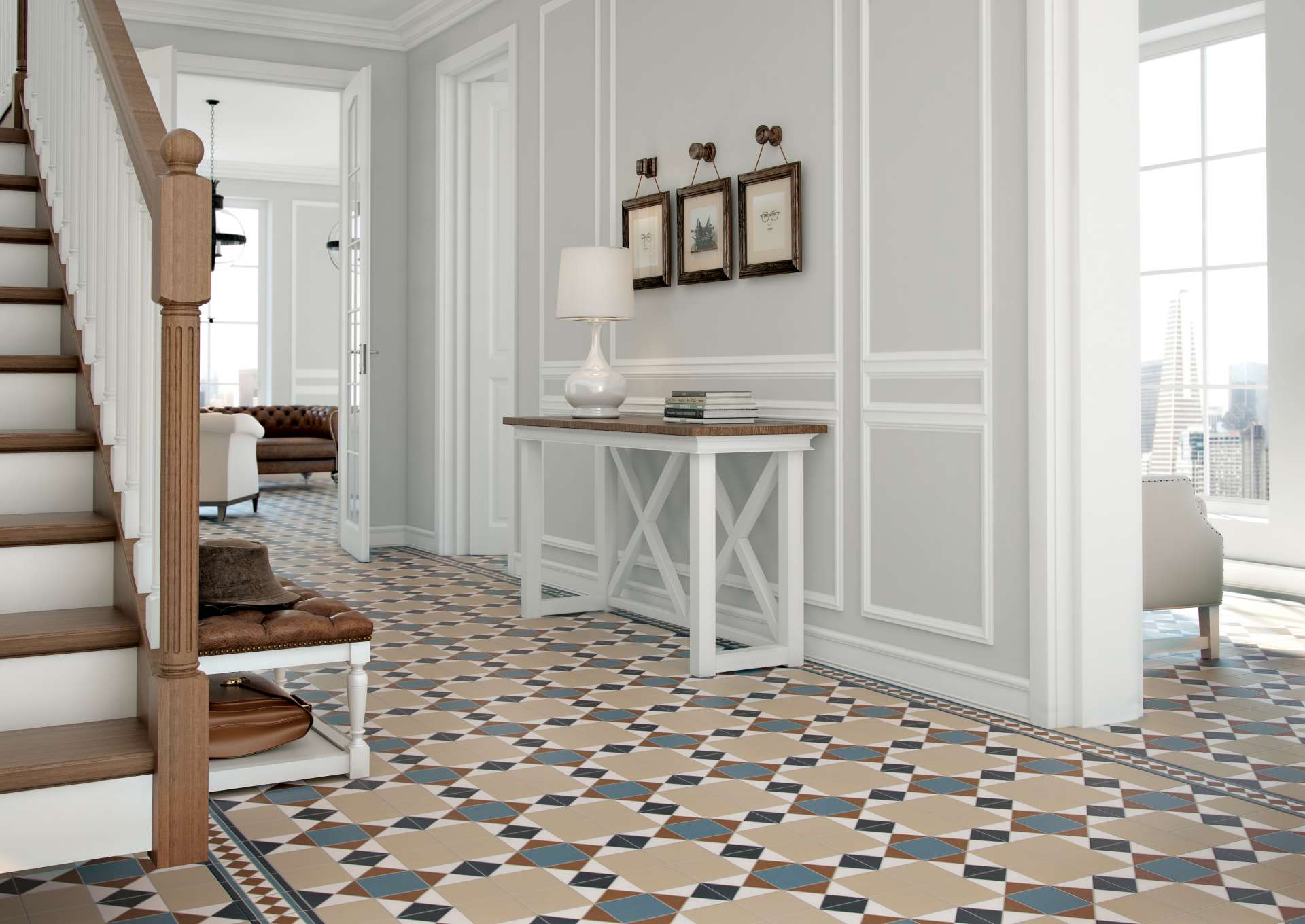 - Ein eklektischer Boden aus Fliesenstücken mit einer Vielzahl von Mustern passt zu einem ethnischen oder fusionistischen Korridor.