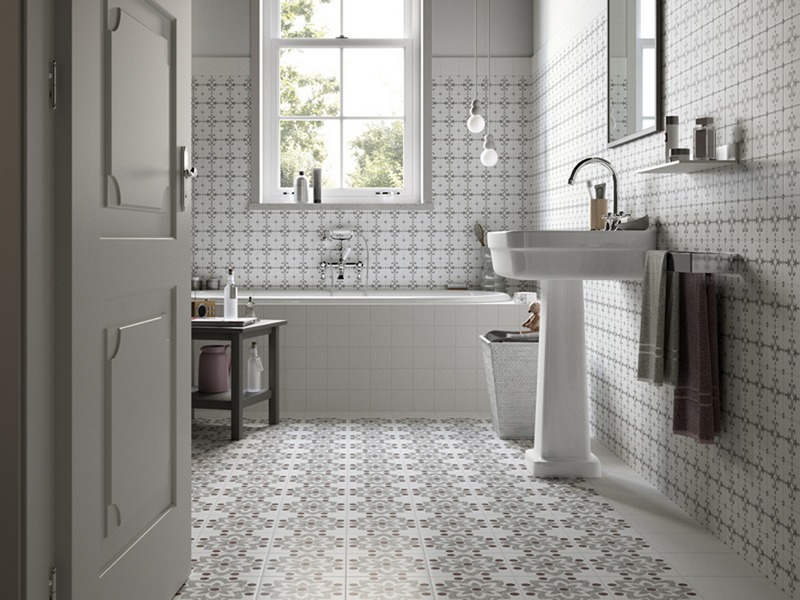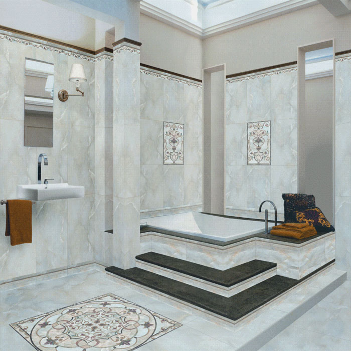 Die Verwendung von Ornament ist eine Möglichkeit, den Raum in Zonen zu unterteilen. Vor dem Hintergrund eines solchen Bildes sehen Möbelstücke sehr schön aus. Die Fliese mit einem sich wiederholenden Ornament in modernem Design gilt als ein geeignetes Material für Badezimmer.