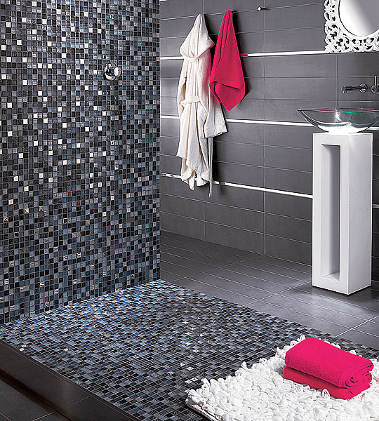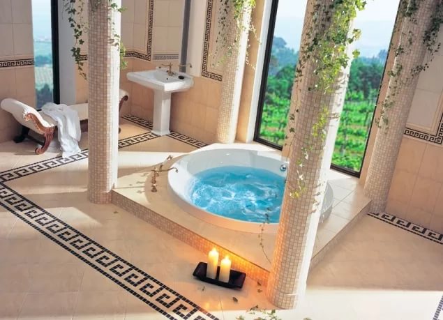 Antiker Stil kann verwendet werden, um Bäder, Pools oder Spa-Bereiche zu dekorieren. Diese Tradition kommt aus Rom, wo Keramik verwendet wurde, um den Begriff (Bad) zu schaffen. Antike Fliesen machen Ihr Badezimmer luxuriös. Eine andere Lösung im Stil des römischen Begriffs, die bei der Herstellung von Badezimmern in öffentlichen Einrichtungen verwendet wird, ist ein kleines Mosaik kombiniert mit monochromatischen Elementen.