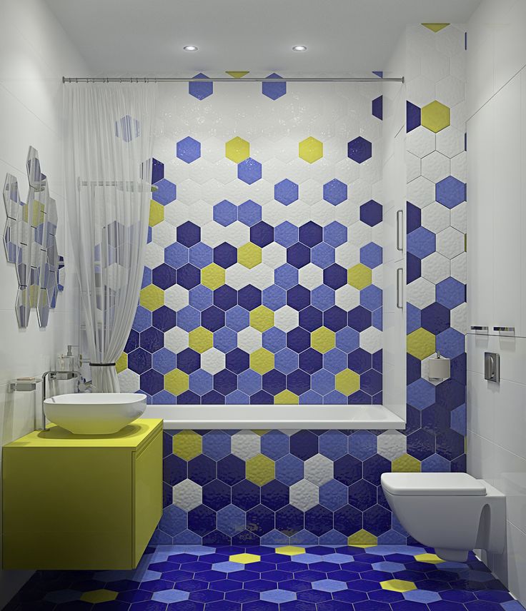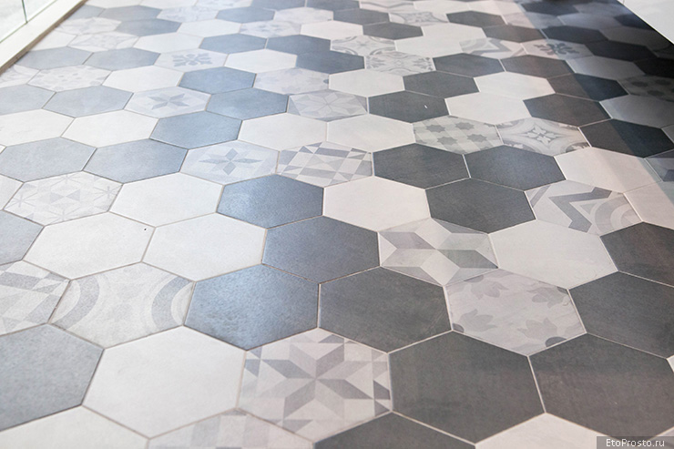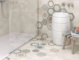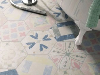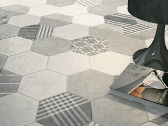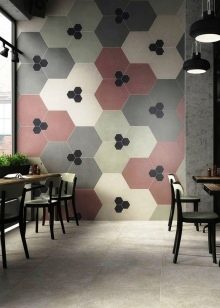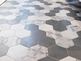 Das Kacheldesign kann in der Farbe variieren. So präsentieren die Hersteller im Rahmen einer Kollektion Modelle, die in benachbarten Farbtönen derselben Farbpalette hergestellt werden. So können Sie helle Bereiche auf dem Boden auswählen und interessante geometrische Muster auslegen: Blumen, Rauten und andere Formen. Sogar ganze Bilder sind mit kleinen sechseckigen Fliesen geschmiedet.