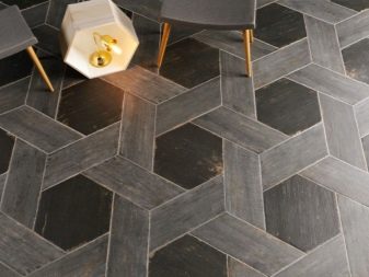 Separat zu erwähnen ist das Design der laminierten sechseckigen Fliesen. Diese Produkte werden durch Injektionsmethode hergestellt. So kann die Textur der Fliese andere Materialien übertragen: Imitation von Marmor, Parkett, Holz, Metall, Leder.