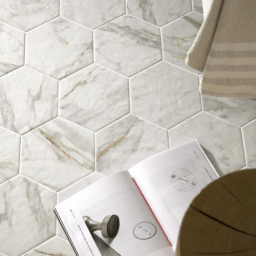 Die neuen Kollektionen der Marke Impronta präsentieren sechseckige Muster in Marmor. Außerdem hat die Beschichtung interessante Perlglanzschlieren mit glänzendem Glanz.Fliesenbeläge dieser italienischen Marke wirken elegant und elegant.