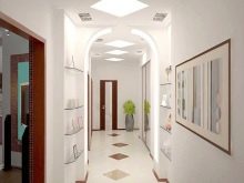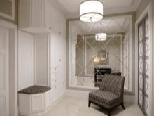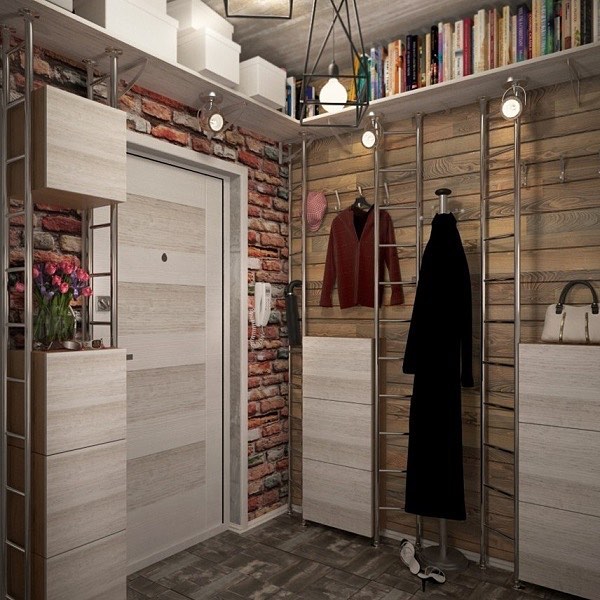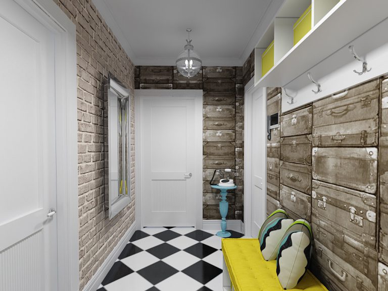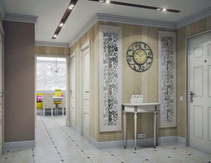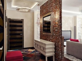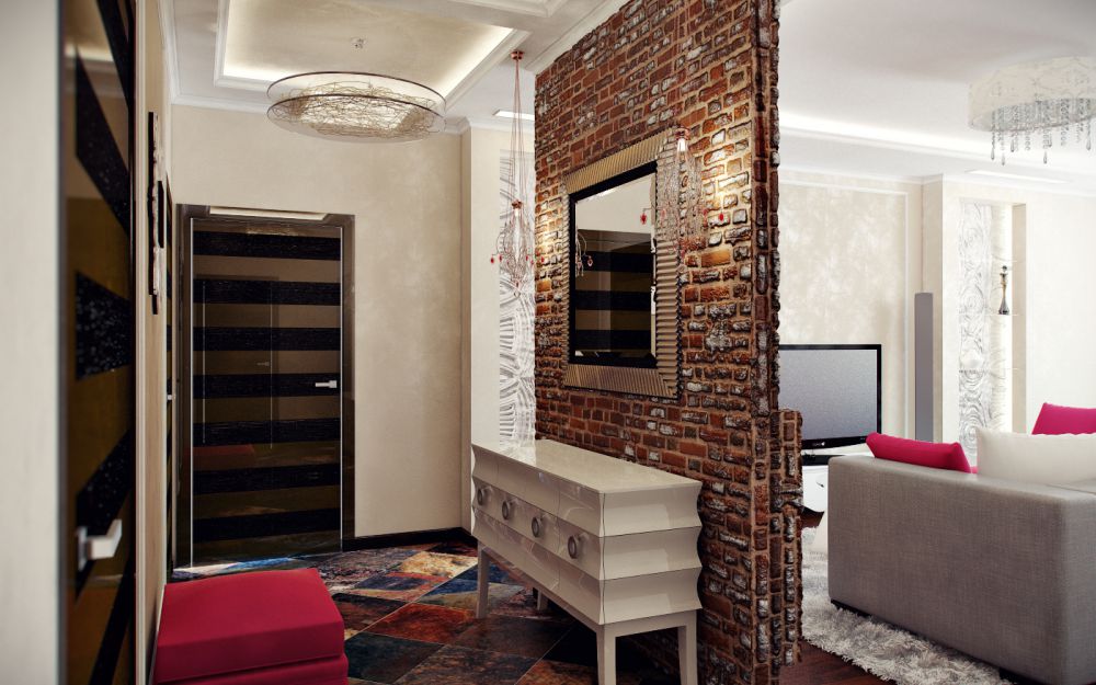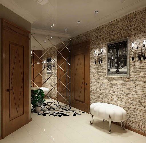 Im Inneren der Halle wird es interessant sein, einen schönen Stil mit einem Offset zu sehen. Es ermöglicht Ihnen, den Raum visuell zu erweitern. Auf diese Weise können Sie Mauerwerk simulieren.