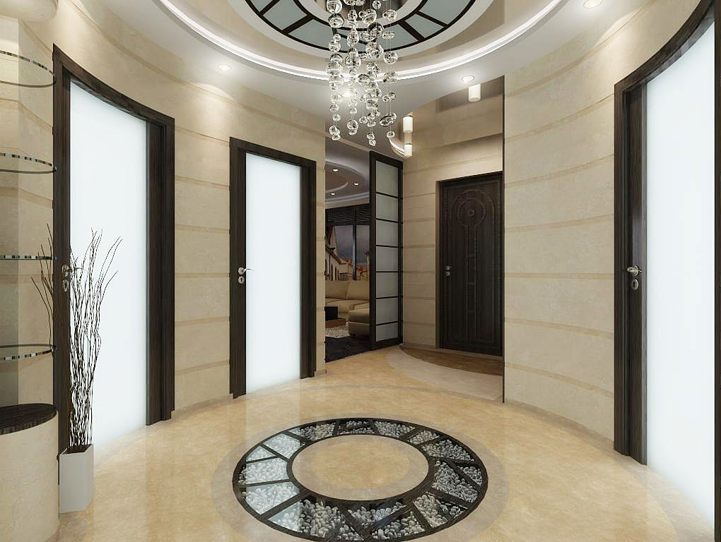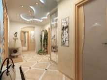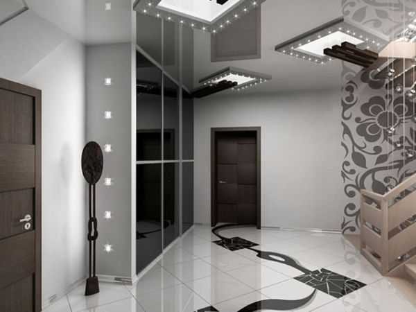 Innenräume mit Stil Hi-Tech oder Minimalismus Sie können glänzende oder spiegelnde Fliesen herstellen und die Decke mit ähnlichen Beschichtungen freilegen. Sie können sogar einen glänzenden Sockel aus Porzellan machen. Für einen solchen Flur besser geeignet, grau, dunkelbeige, schwarz. Fliesen mit einem 3D-Muster passen perfekt in solche Innenräume.