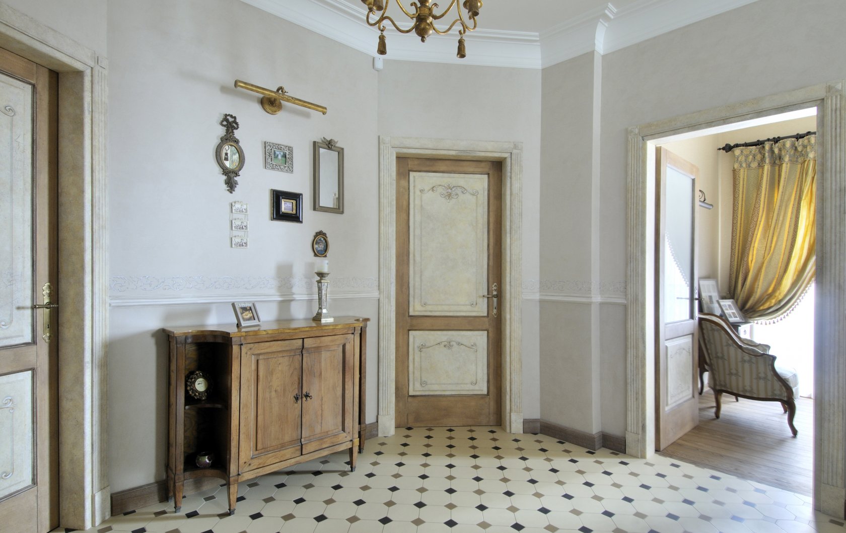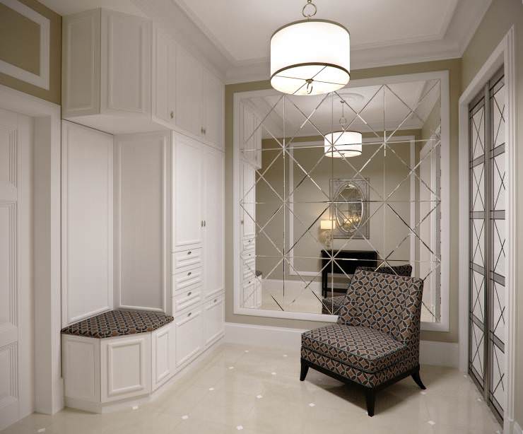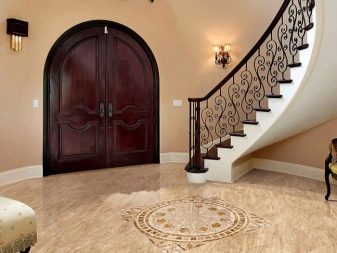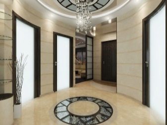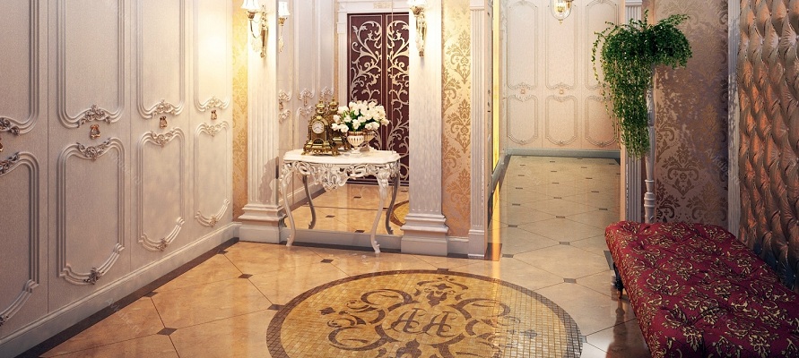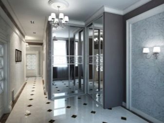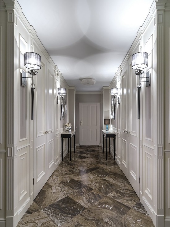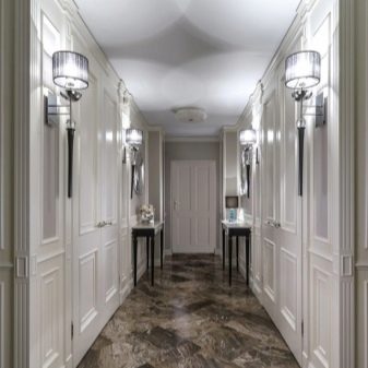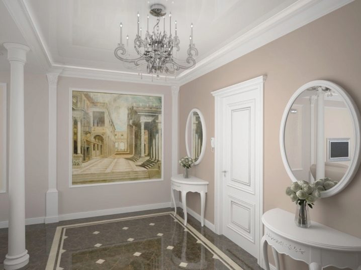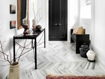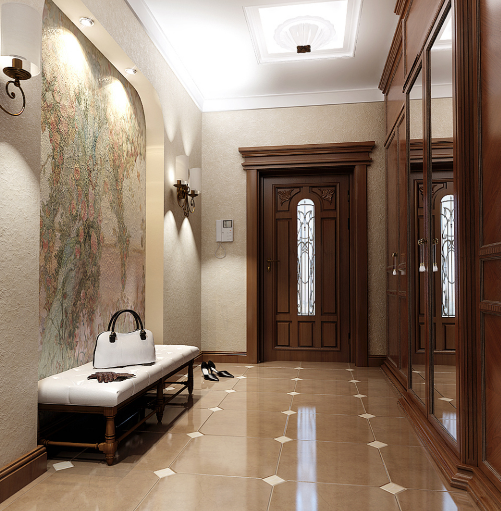 Wenn das Innere Ihrer Wohnung oder Ihres Hauses vorherrscht klassischer Stil, dann können Sie eine trendige Marmor- oder Pflasterfliese wählen. Dieses stilvolle, aber eher strenge Design wird harmonisch mit den hellen Fassaden des Schrankes und anderen Möbeln im Flur kombiniert. Aber eine vielseitige Option für den Flur ist eine einfache Beschichtung.
