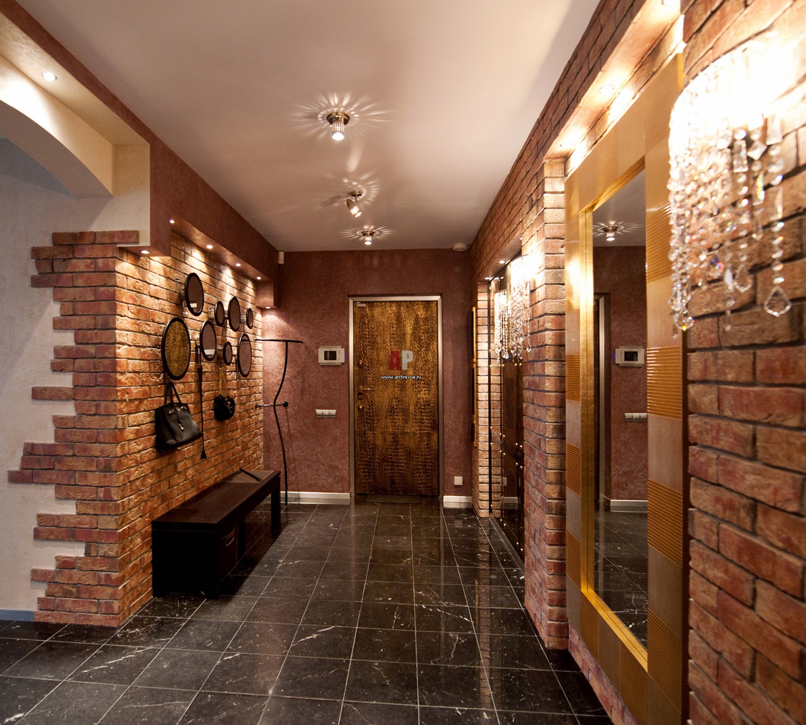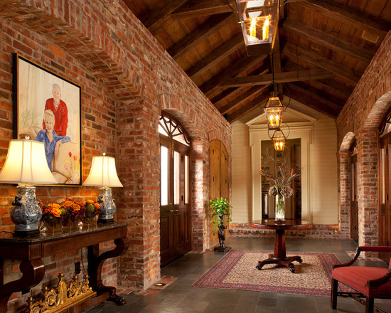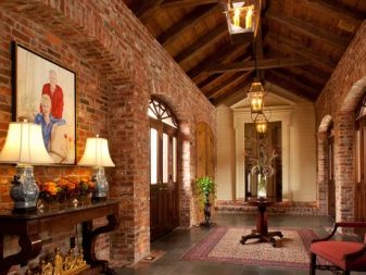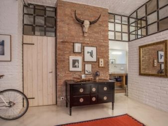 In den Fluren mit einem Interieur im Stil Loft Die Fliese unter einem Ziegelstein oder einem großen Stein wird perfekt aussehen. Am besten geeignete Modelle aus Porzellan.