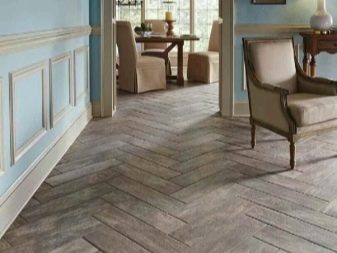Wenn Sie das Innere ausmachen im Country- oder Country-Stil, dann können Sie Modelle von Fliesen unter dem Baum oder gepflasterten Brett verwenden. Die Hauptsache ist, dass der Boden mit einer solchen Beschichtung massiv und natürlich erscheint.