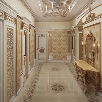 Achten Sie auf die Größe.Wenn der Flur klein ist, dann ist es besser, kleine Mosaikfliesen oder Paneele darin zu legen. Aber im Flur und im Flur in einer 2-Zimmer-Wohnung mit großer Fläche können Sie große Modelle mit einem bereits vorbereiteten applizierten Ornament stapeln.