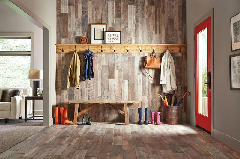 Das Farbdesign der Fliesenmodelle wird auch durch das Design beeinflusst. So gibt es dunkle Optionen, die Naturstein nachahmen, es gibt marmorierte Produkte. Beide und andere sehen elegant und elegant aus. Im Flur sind oft Fliesen mit Holzstruktur und in natürlichen "Holz" Farbtönen verlegt. Es können sowohl helle als auch dunkle Proben sein.