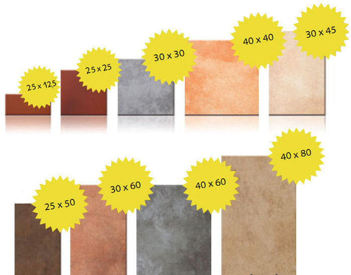 Standardgrößen sind Bodenfliesen 30 mal 30 oder 20 mal 20 cm.Dies sind quadratische gleichseitige Modelle, die einfach mit den eigenen Händen zu legen sind. Aber Hersteller haben andere Möglichkeiten, zum Beispiel eine rechteckige Form. Dies sind die Modelle 30 x 20 oder 25 x 20 cm, und innerhalb der gleichen Kollektion stellen die Hersteller oft Fliesen gleichen Designs, aber unterschiedlicher Größe dar.