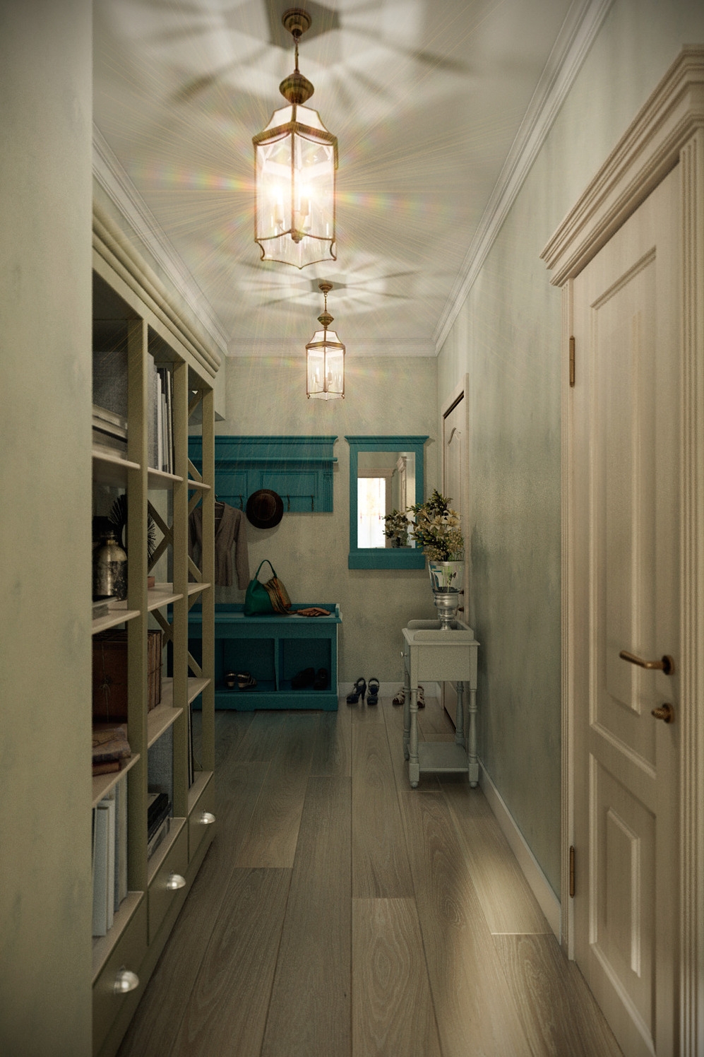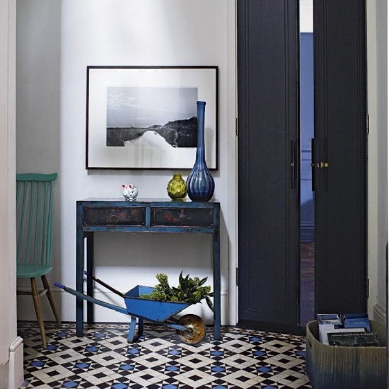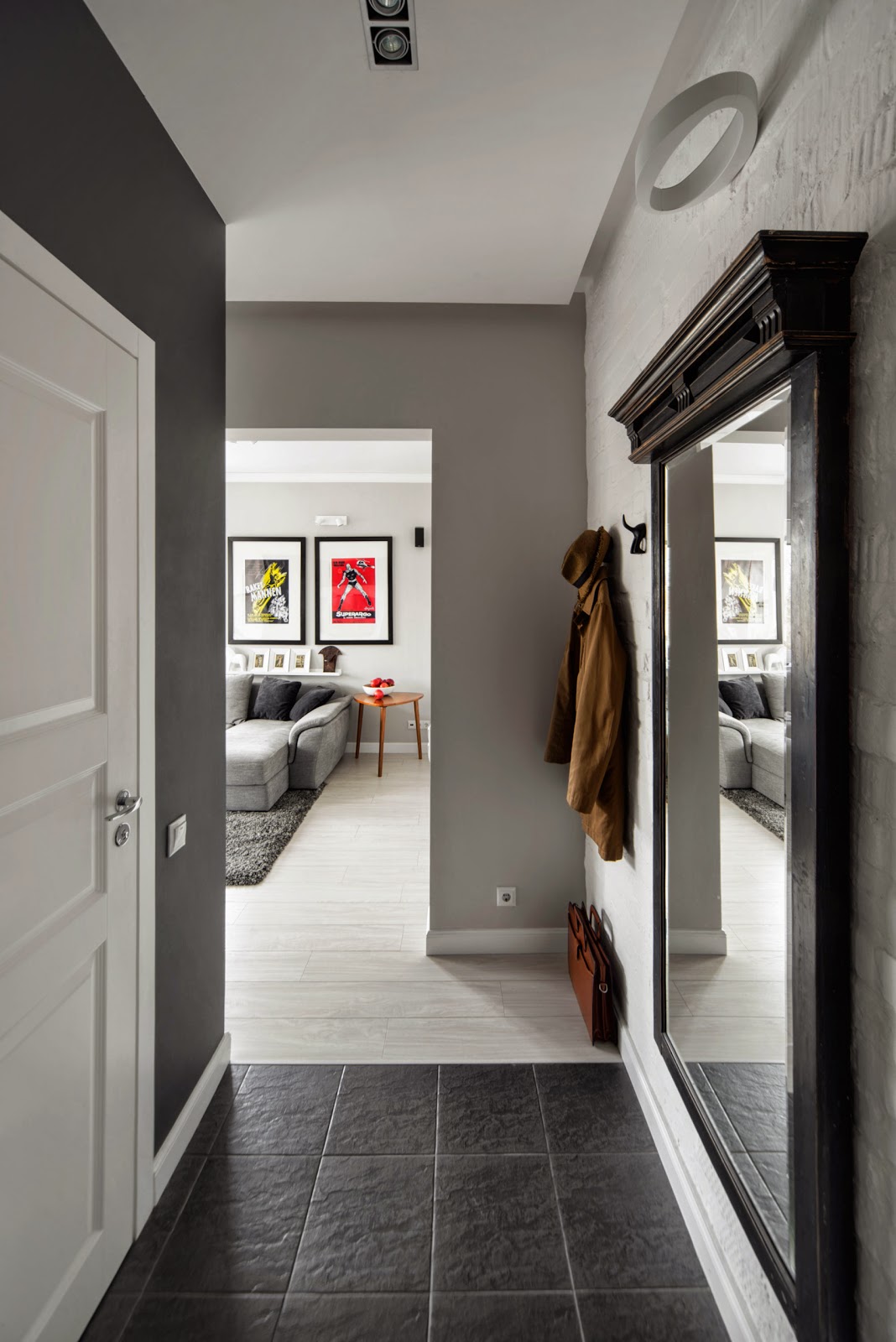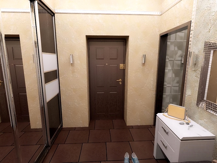Am Eingang müssen Sie die stabilsten und hochwertigsten Fliesen, zum Beispiel Feinsteinzeug, verlegen, und weiter, näher zum Flur, können Sie den Boden mit einer mehr skurrilen Beschichtung trimmen.