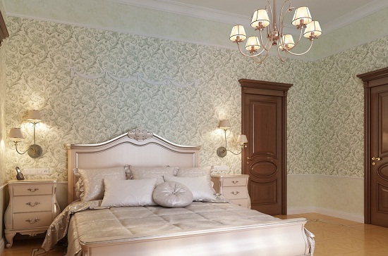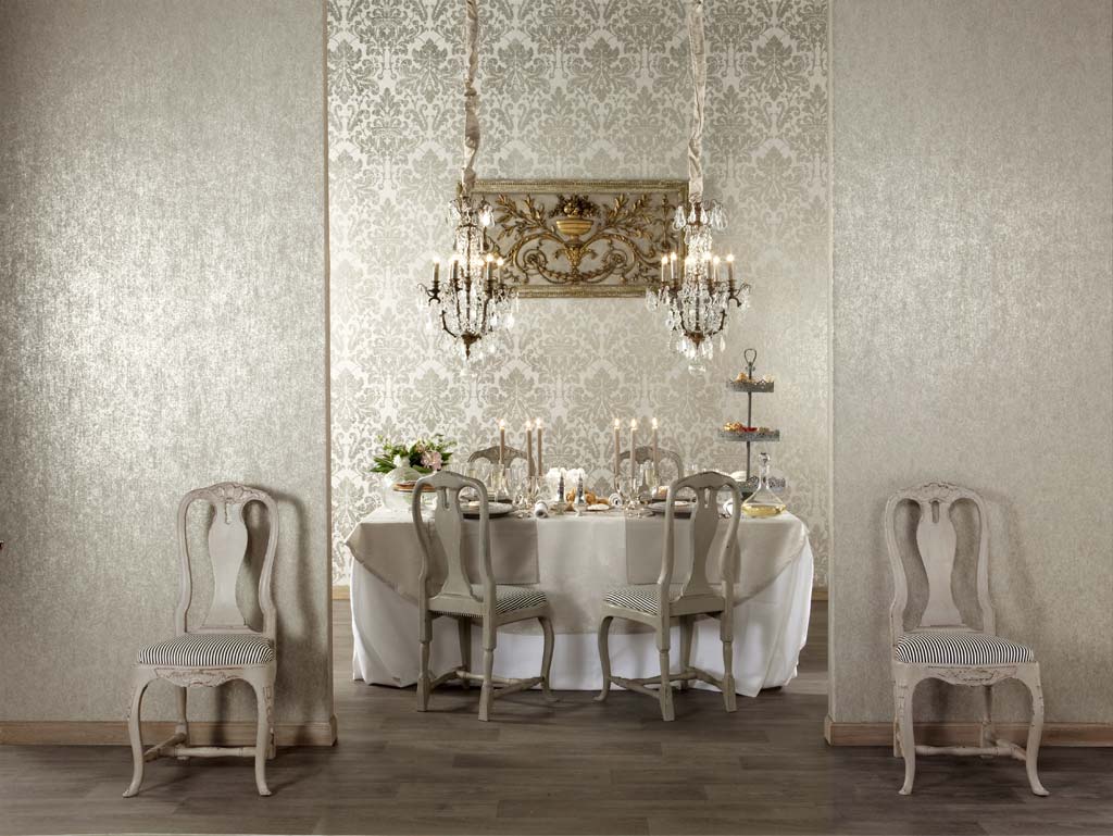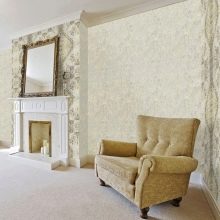 - Die Wände mit exquisiten Mustern, Ornamenten, silbernen oder goldenen Mustern werden die Zimmer im klassischen Stil schmücken. Auch Siebdruck, Tapeten mit Prägung oder Pailletten sind hier relevant.