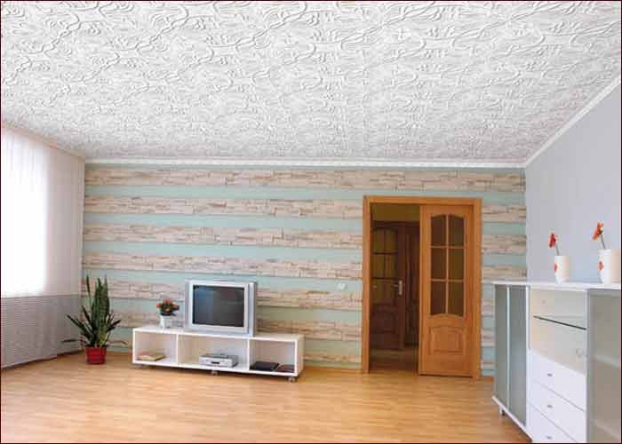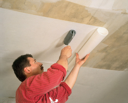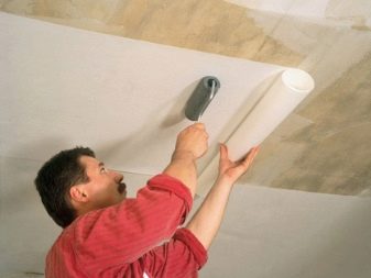 Tapeten können nicht nur für die Wanddekoration verwendet werden. Sie können an der Decke hängen bleiben. Es kann eine glatte monophone Leinwand, eine interessante Volumenstruktur oder sogar ein interessanter Druck sein. Ein solches Design wird den Raum zu kleinen Kosten originell machen. Obwohl es sich lohnt, darüber nachzudenken Diese Beschichtung hält keiner hohen Luftfeuchtigkeit stand.
