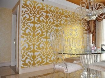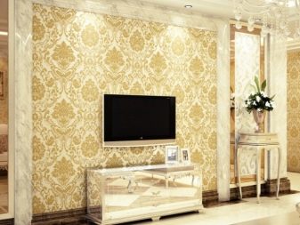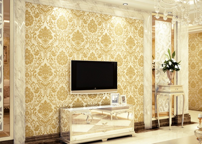 Für ein luxuriöses Interieur im Stil von Rokoko oder Renaissance ideale Tapeten, die an diese schicken Stoffe erinnern. Das ist nicht nur eine Illusion. Die zweite Schicht solcher Beschichtungen sind Textilien. Es kann Velours, Seide oder andere Gewebefasern sein. Dieser Entwurf kann einen Raum in eine Luxuxwohnung verwandeln. Allerdings sind die Kosten für dieses Material viel höher als die Preise für Vinyl und Papier. Außerdem, Solche Tapeten können nicht gewaschen werden.