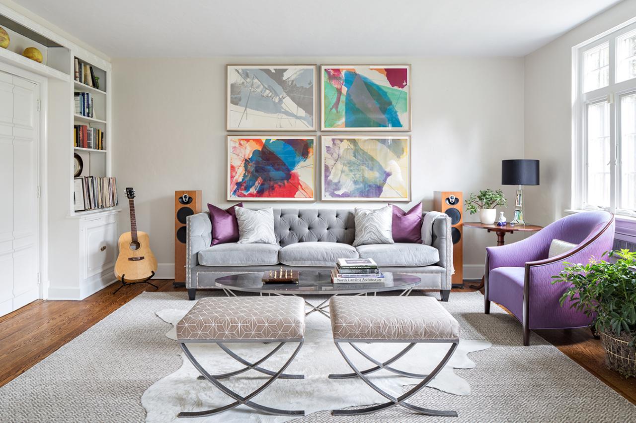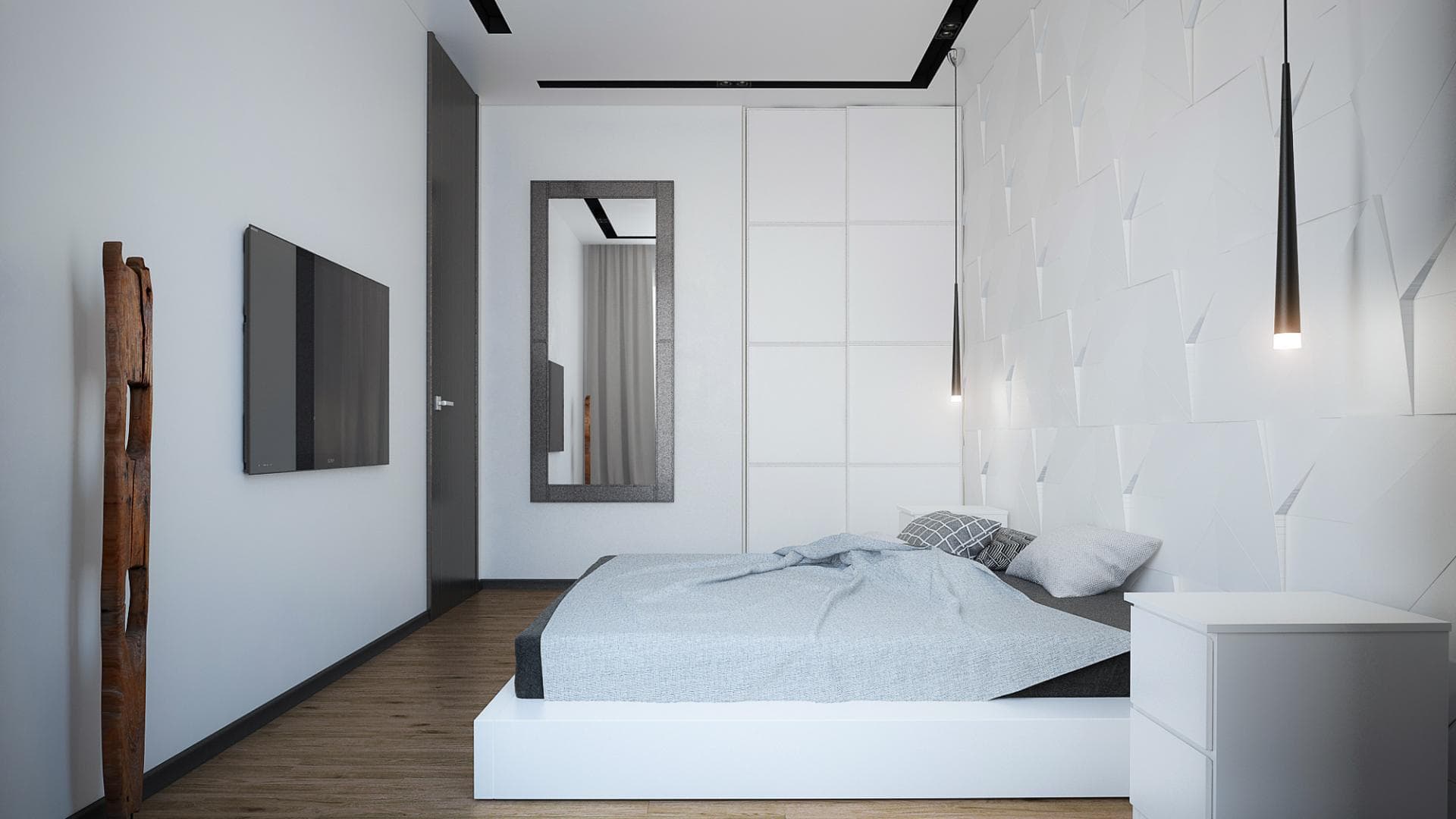 Die Kombination von Uni-Leinwänden mit schwarzen und weißen Tapeten schafft ein stilvolles modernes Interieur mit einer einzigartigen Persönlichkeit. Und hier ist ein weiteres Beispiel, wie Sie einen weißen Raum hell und nicht langweilig machen können: Die Kombination von Weiß, Beige und Hellgrau wird ideal sein, die eine ausgezeichnete Basis für helle violette, blaue und Burgunder-Töne schaffen.Bodenbelag in Brauntönen bringt Wärme in den Raum.