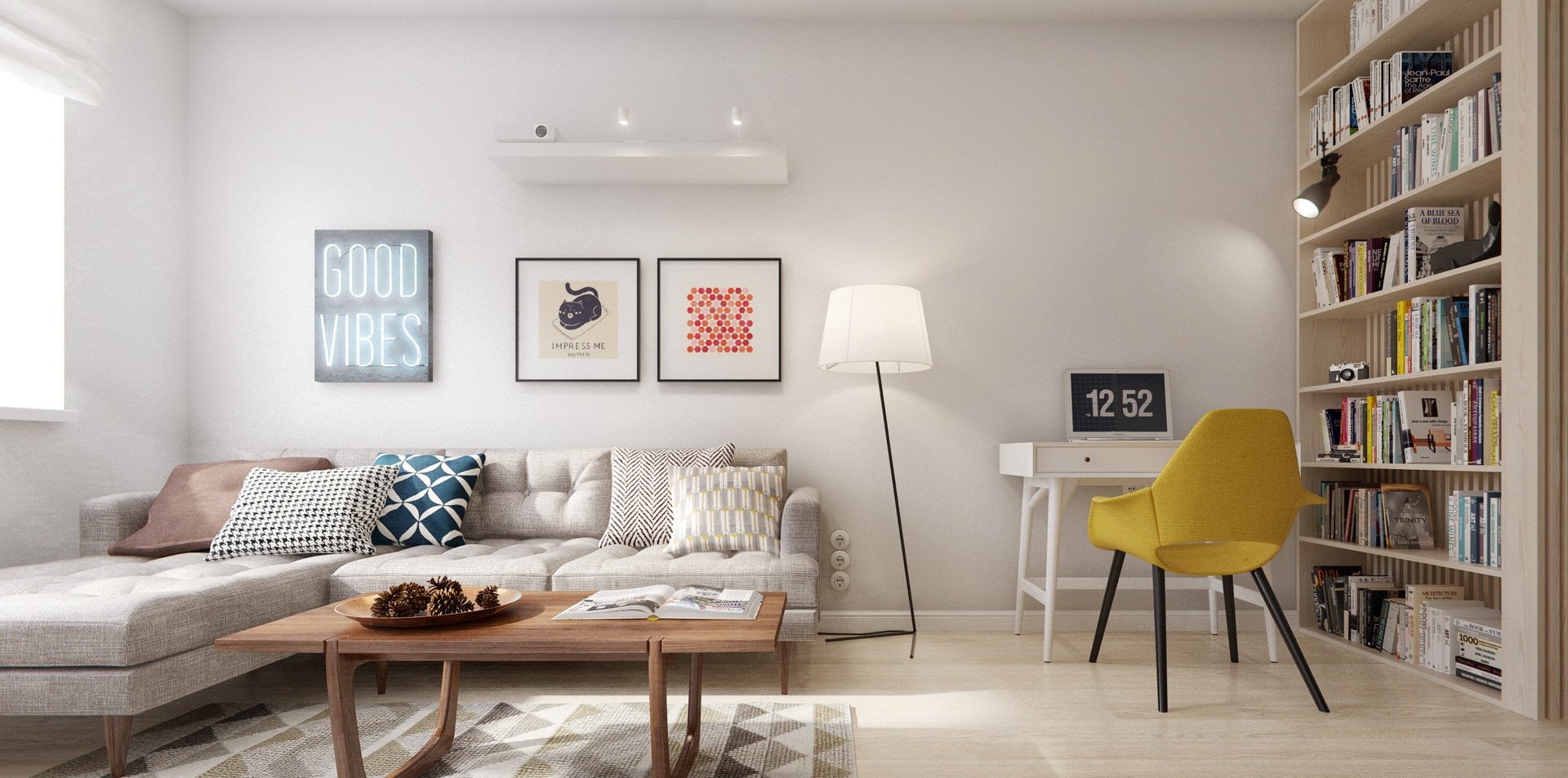 Glatte weiße Wände - die Basis des skandinavischen Stils. Ein paar helle Details und Elemente, die für diese Stilistik charakteristisch sind - und der Raum wird sofort interessant und komfortabel.