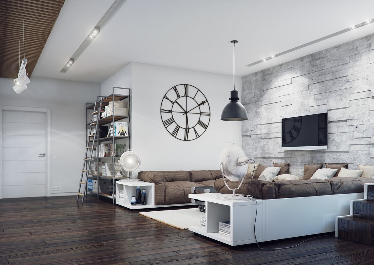 Perfekt passen glatte weiße Tapete und Loft-Stil. In diesem Design werden sie erfolgreich mit einer grauen Beschichtung kombiniert, die das Mauerwerk simuliert. Weiße und glatte Wände sind im Minimalismus willkommen. Drucke sind hier ungeeignet.