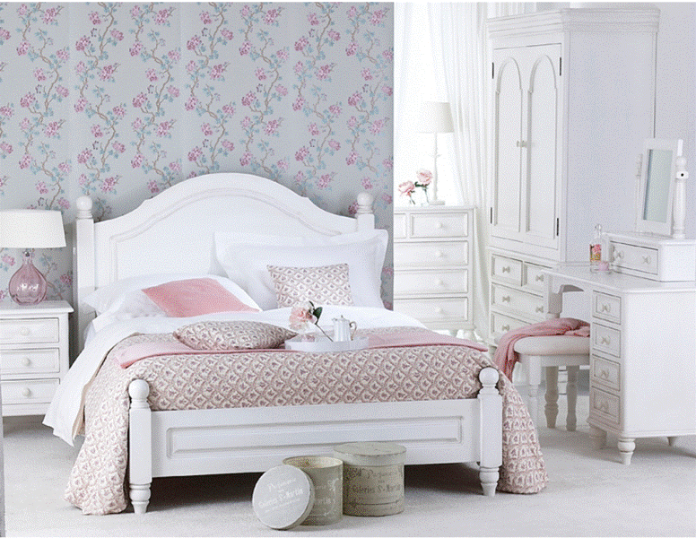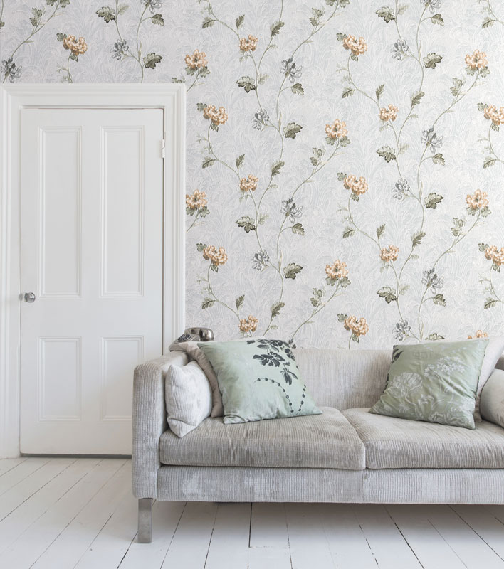 Die Verbindung von Luxus und Eleganz - eine Besonderheit der Klassiker. Weiße Tapete mit strukturiertem Blumendruck wird wirkungsvoll durch Vergoldung ergänzt. Helle Böden und Möbel in sanften Farben runden die Komposition harmonisch ab.
