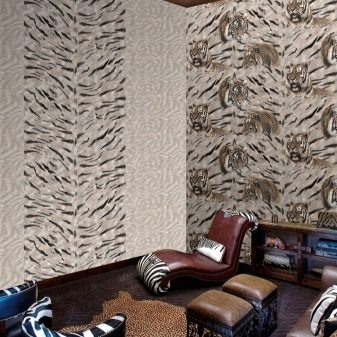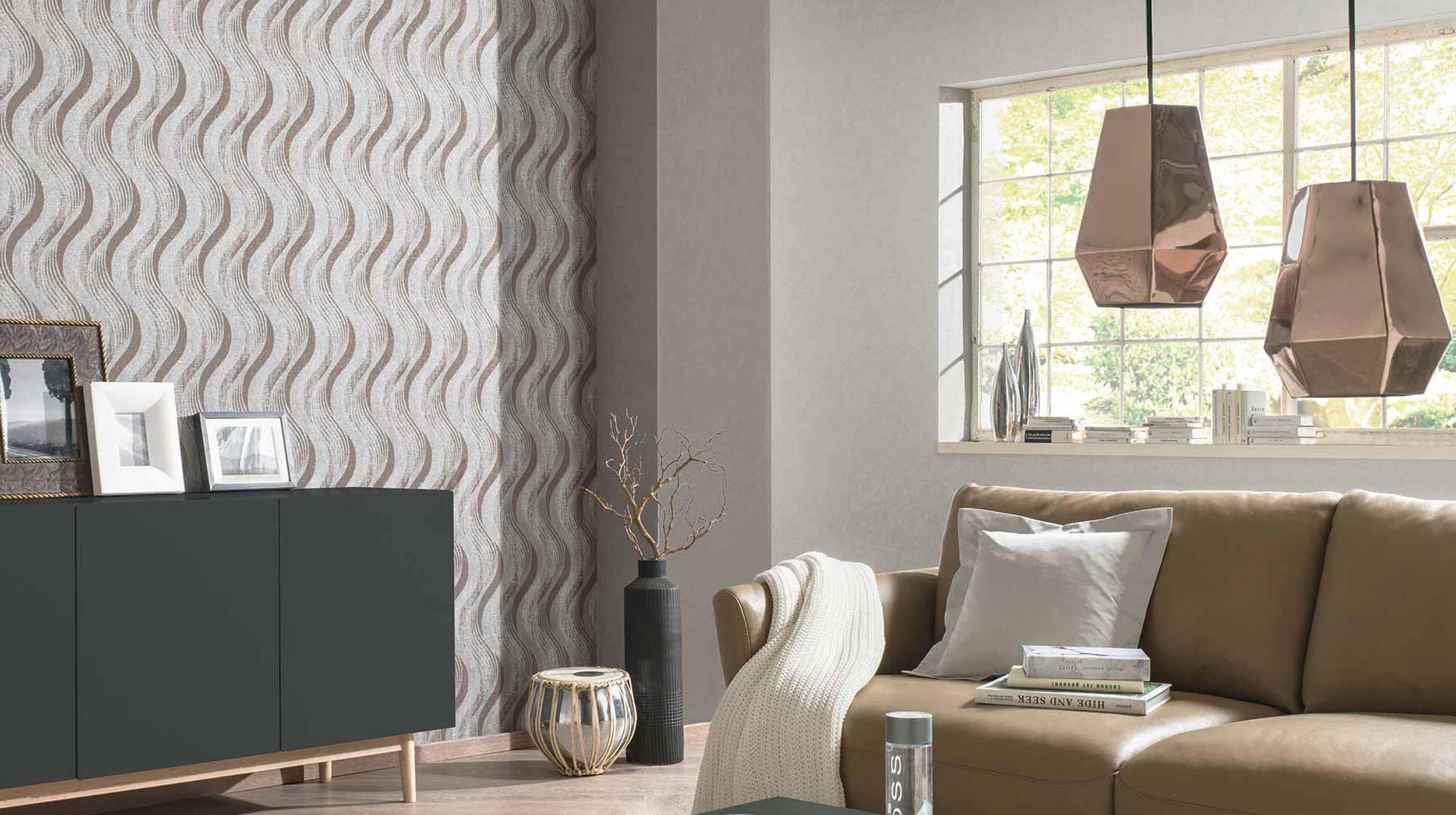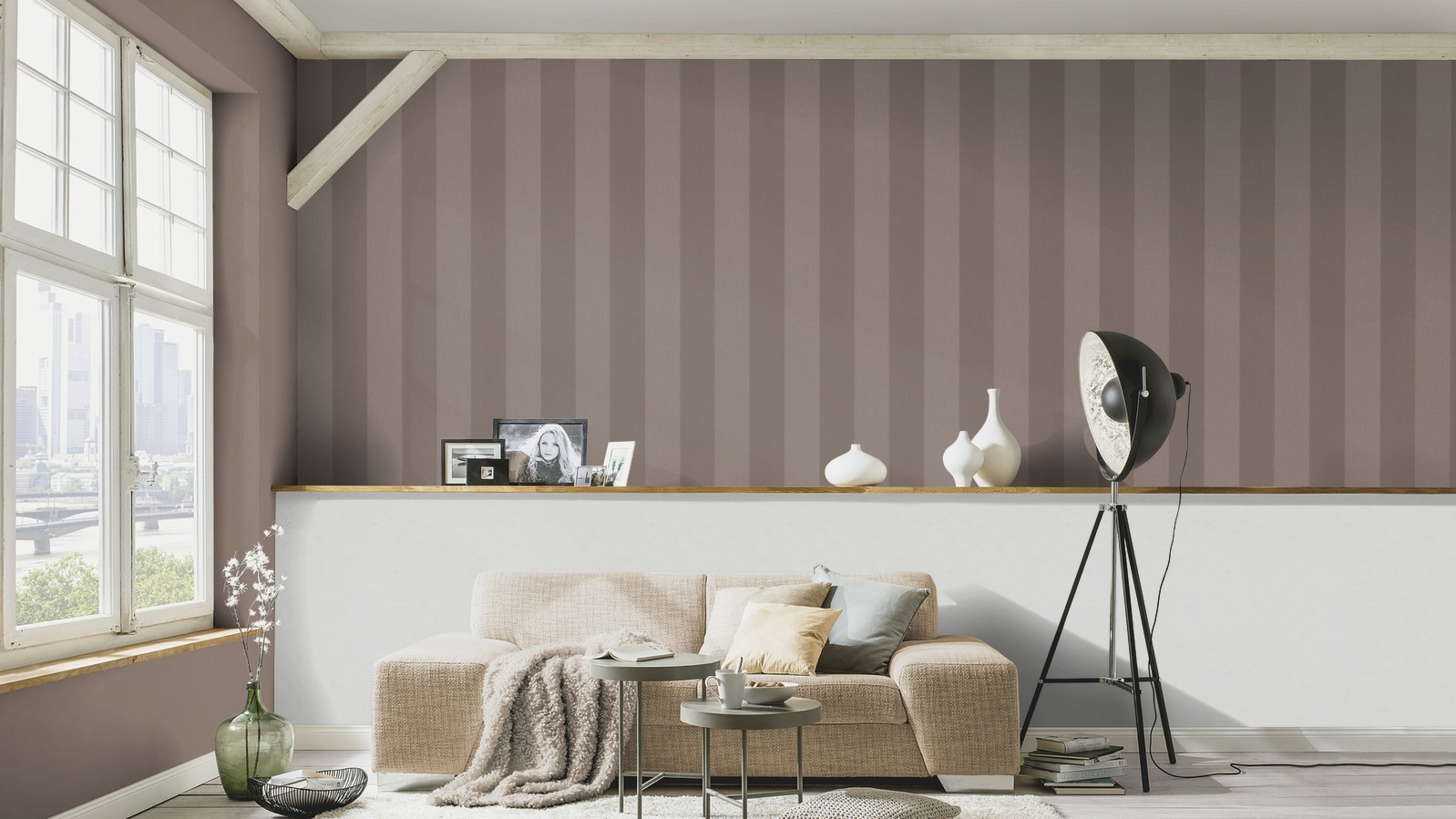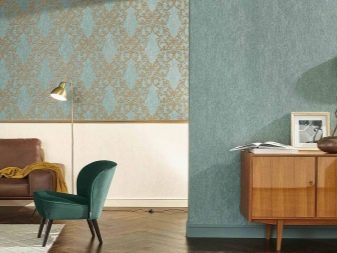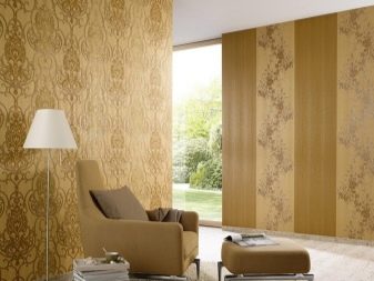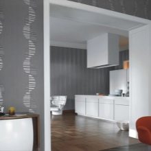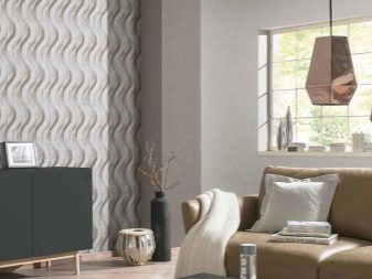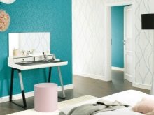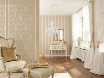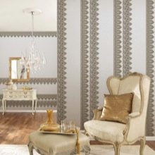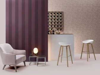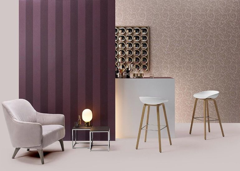 Das Färben kann sehr einfach sein, aber gleichzeitig mit dem dünnsten Schimmer und metallischem Glanz, zum Beispiel Streifen mit ihren feinsten Modulationen. Außerdem gibt es eine anständige Auswahl an Uni-Tapeten.