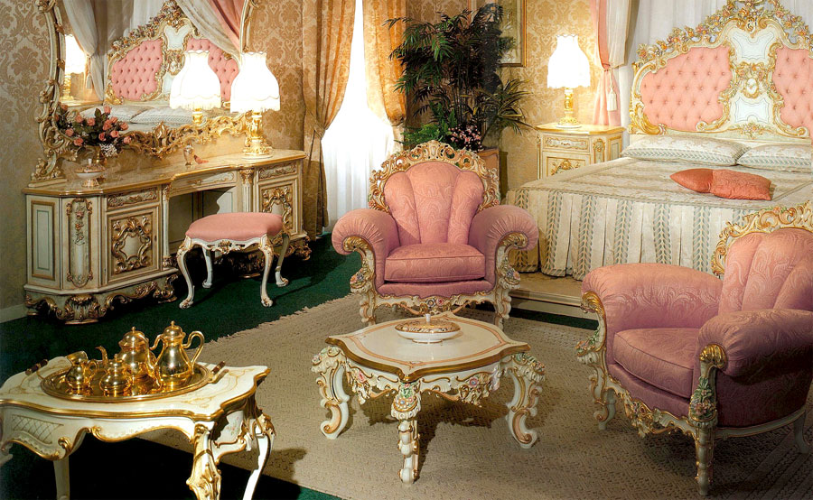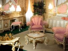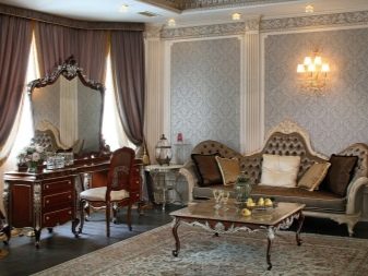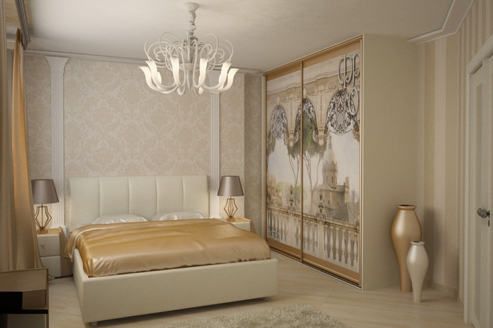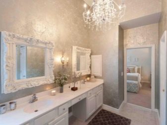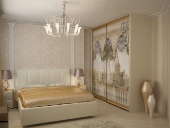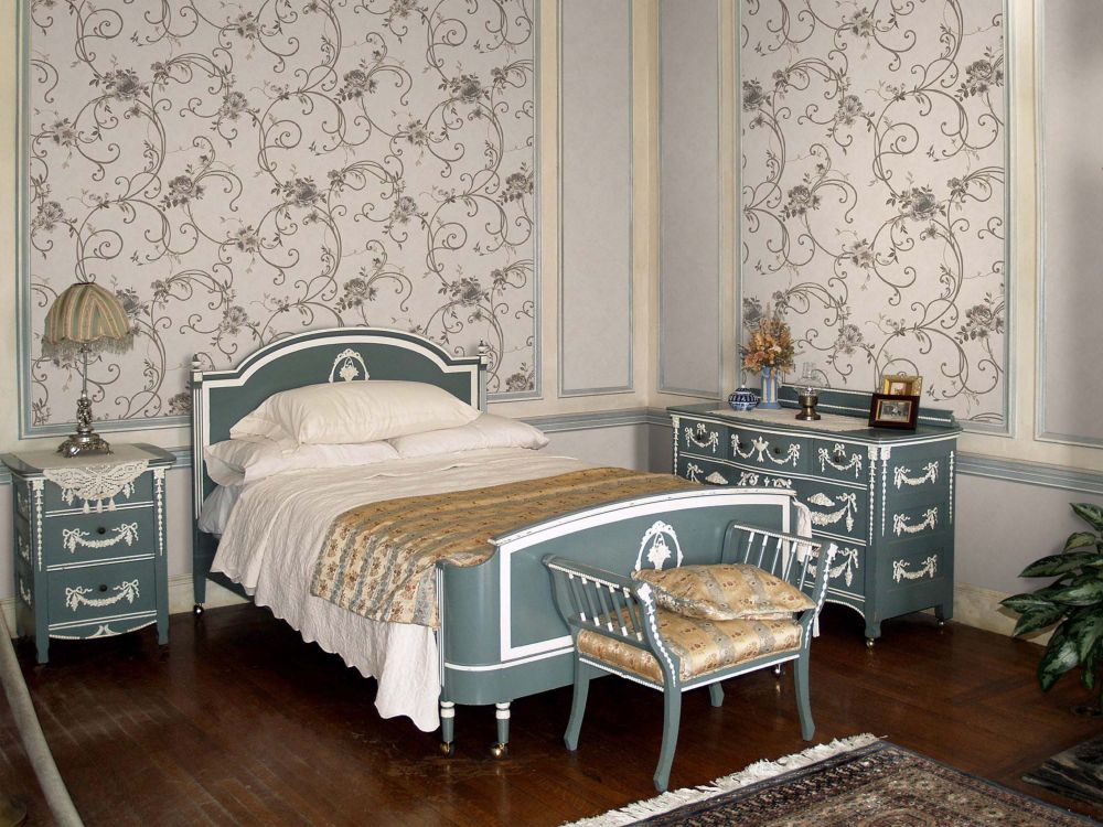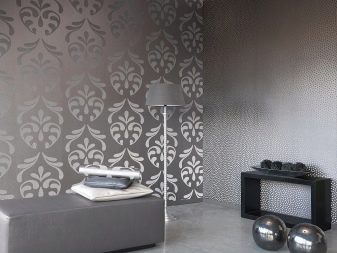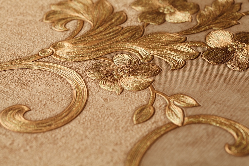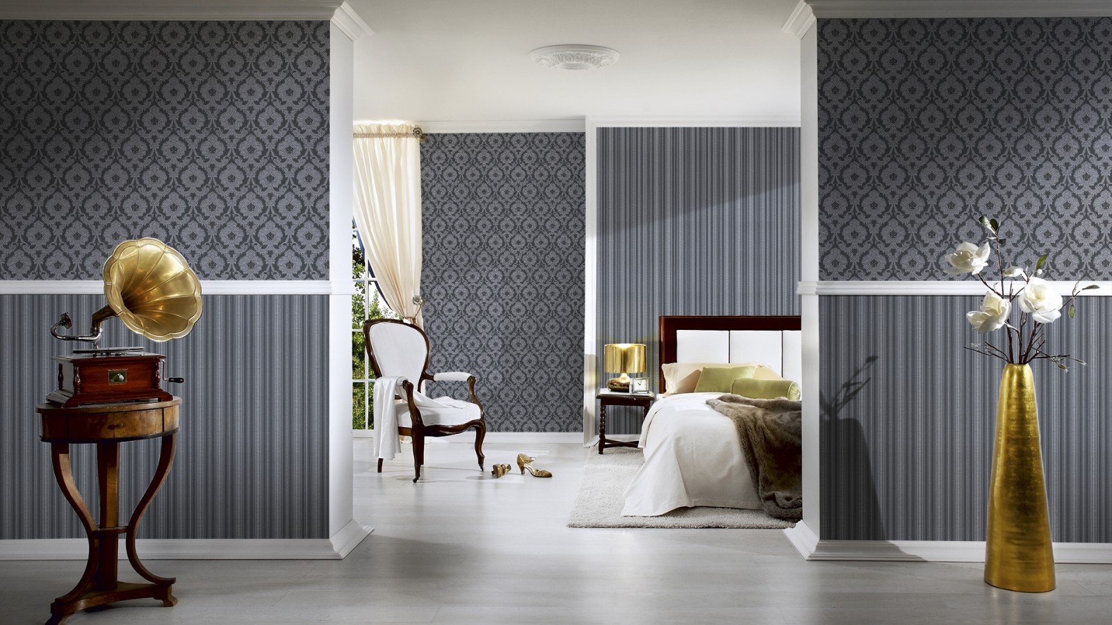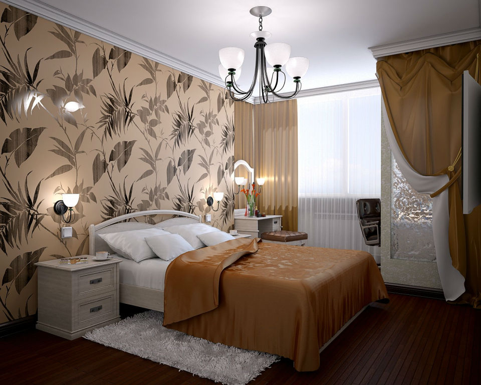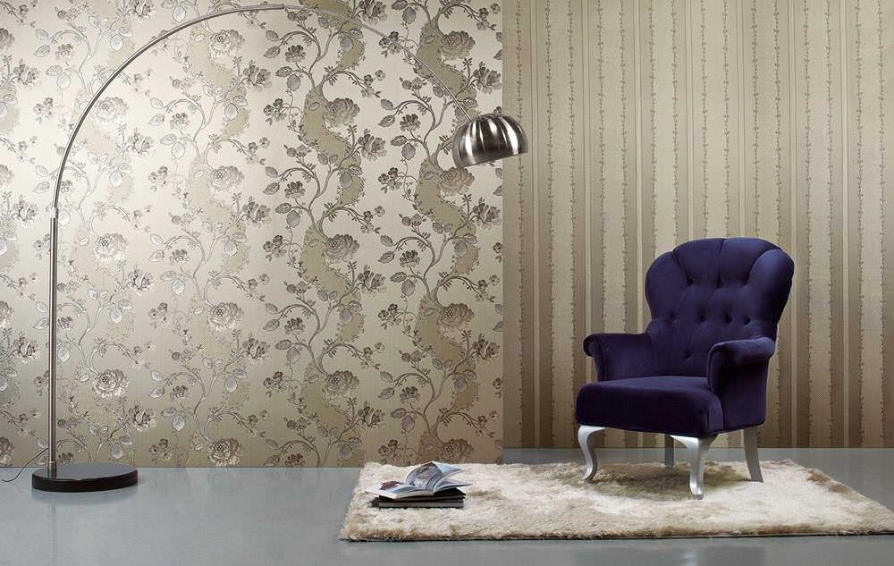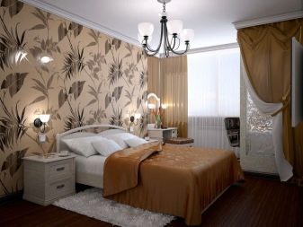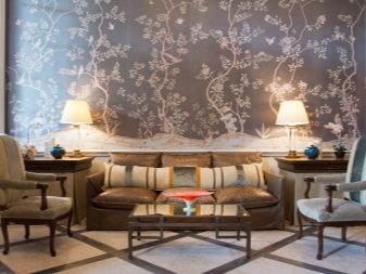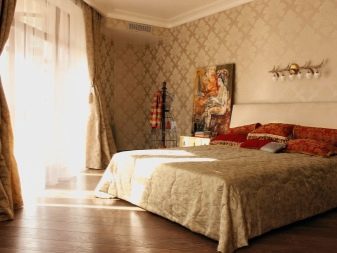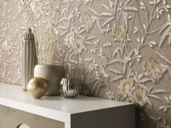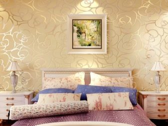 - Siebdruckgemälde, Monogramme und kunstvolle Muster mit Gold- oder Silberfarben passen perfekt in die Innenräume des Palastes. Barock, Empire oder Classic werden solche Beschichtungen unterstützen.Ein gemütliches Schlafzimmer wird die Wand aus Tapeten mit Imitation Stoff mit zarten Licht floralen Mustern dekorieren.
