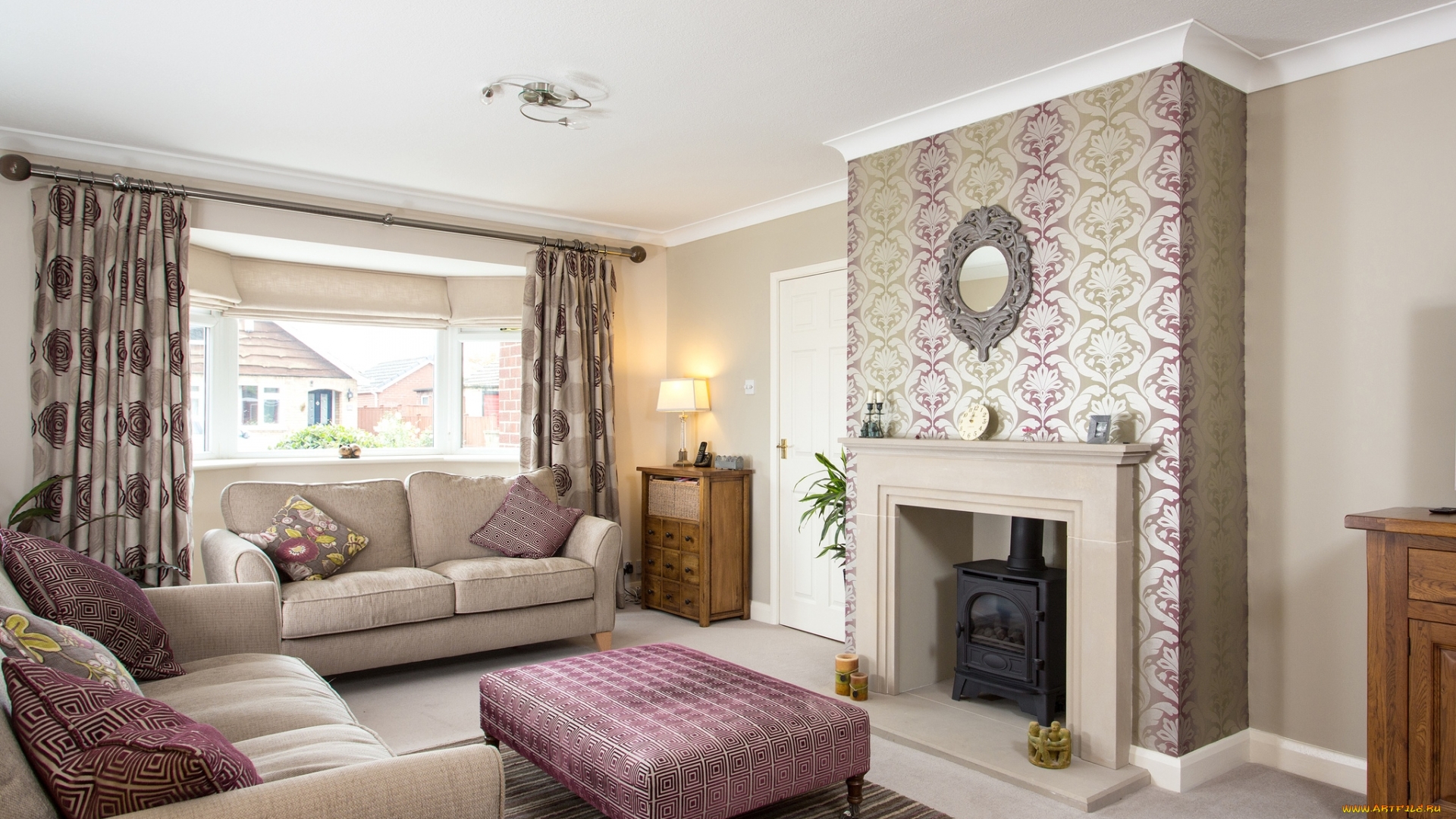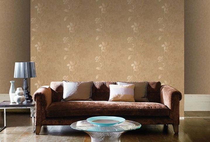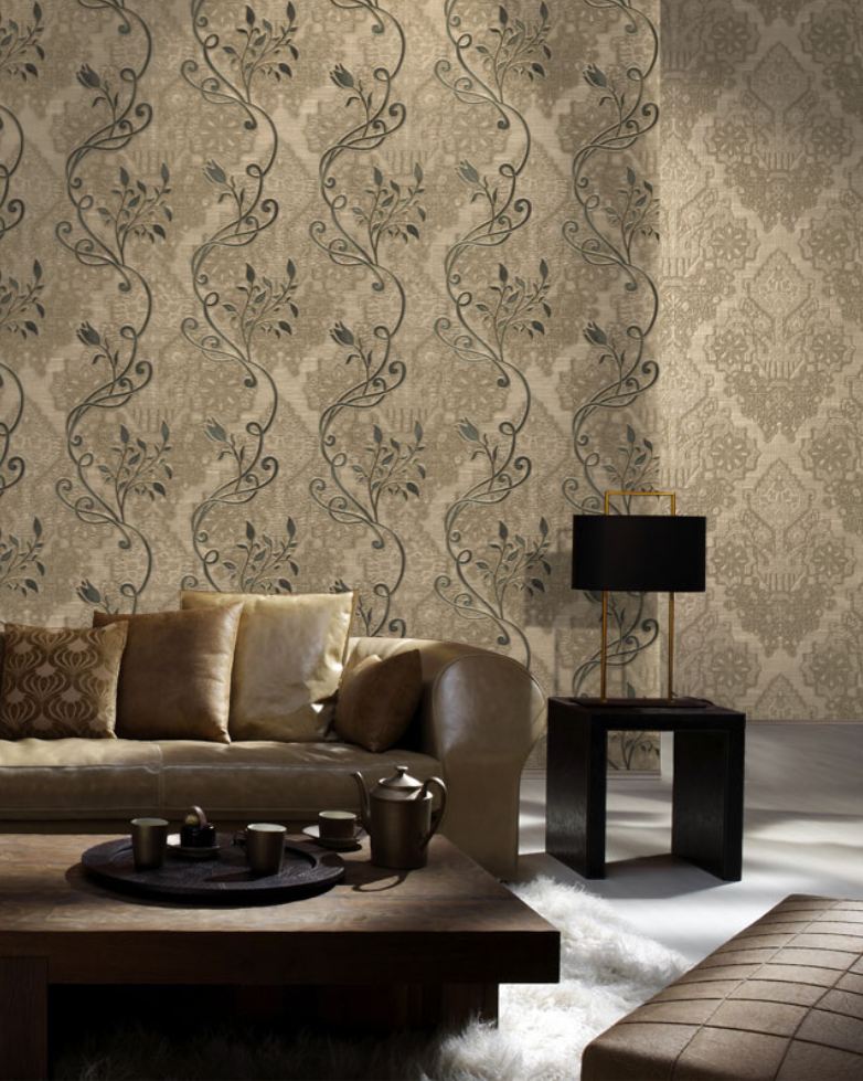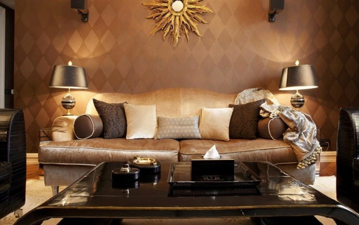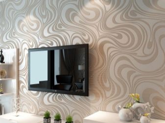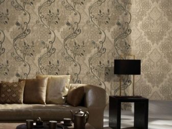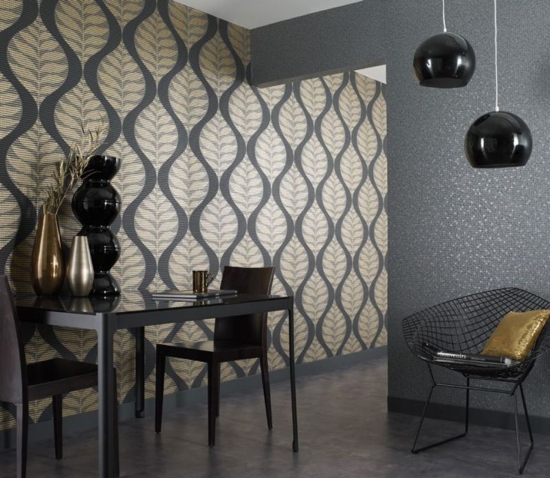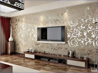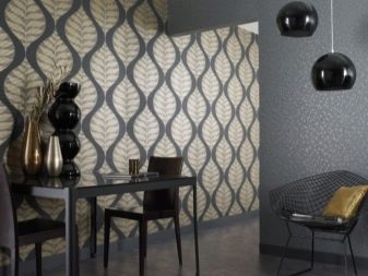Nicht-feurige Tapeten mit einem außergewöhnlichen Muster werden Mut und modischen Akzent hinzufügen, sogar in einer einfachen Umgebung.Die feierliche Atmosphäre in Kombination mit stilisierten Möbeln wird durch Beschichtungen mit großen Mustern reichhaltiger Farbtöne unterstützt.