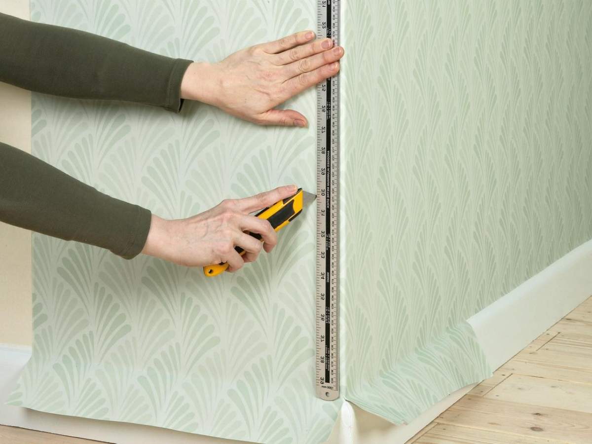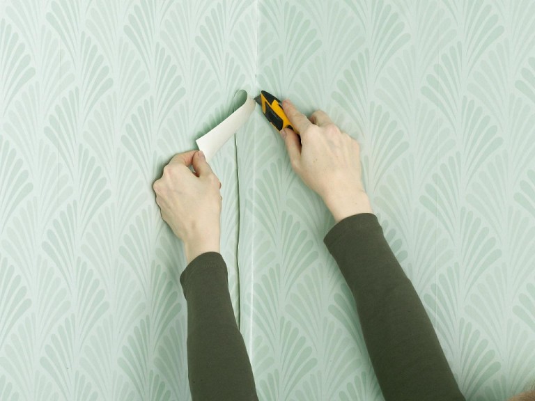In der Mitte der Überlappung wird ein Schnitt gemacht. Entfernen Sie den oberen Teil der Tapete, entfernen Sie den überstehenden Teil der Leinwand.Nach dem Entfernen kleben Sie das oberste Blatt an Ort und Stelle.