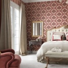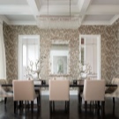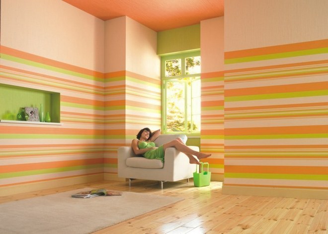 Designer bieten jetzt einen nicht standardmäßigen Ansatz zum Tapezieren der Wände an. Anstelle einer vertikalen Anordnung von Tüchern können Sie horizontal verwenden. Dies führt zu einem neuen Design-Effekt, beispielsweise wenn die Tapete gestreift oder mit einer ausgeprägten einseitigen Anordnung des Musters versehen ist.