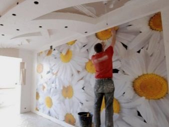 Die Regeln für das Einwickeln von Vinylabdeckungen für die Decke sind die gleichen wie für Wände. Beginne auch aus dem Fenster zu kleben und markiere eine Linie parallel zur Wand. Es ist bequemer, Rollen direkt während des Prozesses auszurollen, um Zeit zu sparen und nicht die Hilfe einer zweiten Person zu verwenden.