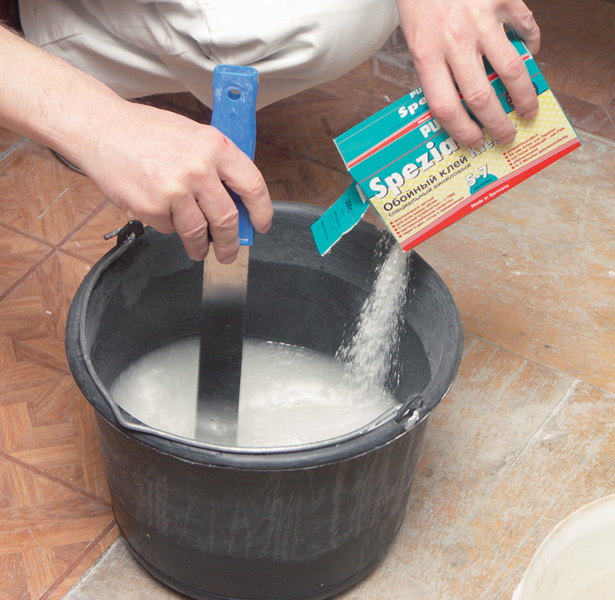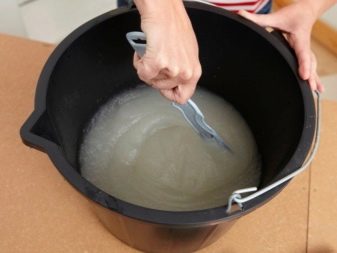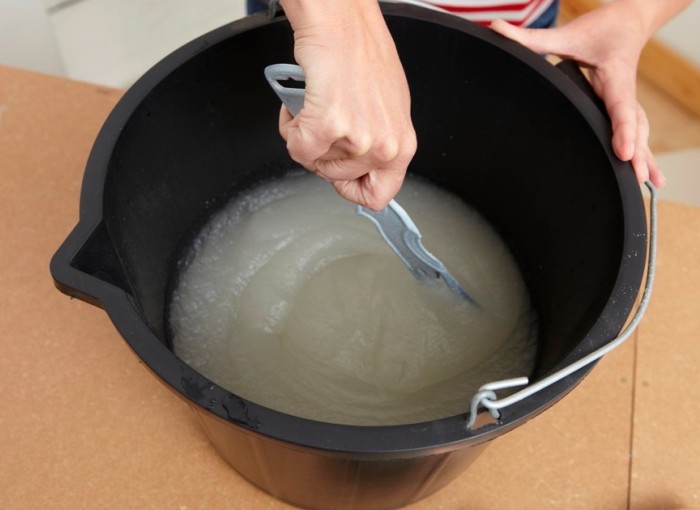 Um den Kleber vorzubereiten, benötigen Sie einen Bau Eimer, Paddel oder Mixer. Gießen Sie das Pulver in den Eimer und fügen Sie die richtige Menge an kaltem Wasser hinzu. Proportionen Hersteller zeigt immer auf das Paket. Grundsätzlich wird die Zusammensetzung einige Minuten gerührt, dann 5-10 Minuten stehengelassen und erneut gerührt.