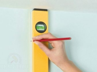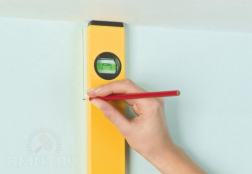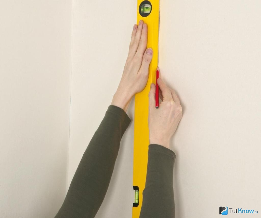 - Wir markieren die vertikale Linie, von wo aus wir mit der Arbeit beginnen werden. Normalerweise aus dem Fenster geklebt. Line Draw mit Level und Lineal.