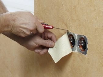 - Steckdosen und Schalter werden in der Regel vor dem Aufkleben demontiert, um den Raum spannungsfrei zu machen. Dann werden Querlinien in die Leinwände geschnitten, wodurch das Material nach innen gebogen wird. Und nach dem Trocknen kehrt alles an seinen Platz zurück.