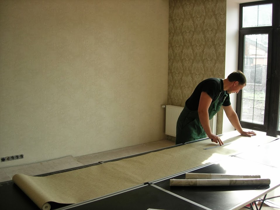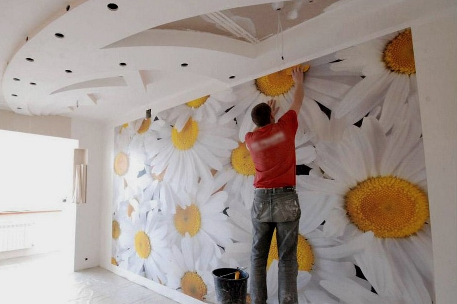 Ihre eigenen Hände zu kleben Vinyl Tapete auf Vlies Basis ist nicht so schwierig, aber es ist besser, einen Assistenten zu nehmen. Tücher sind massiv, oft breit, und sie in Ruhe zu halten ist nicht sehr praktisch.