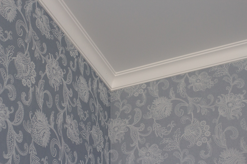 Den Raum mit Vinyltapete zu trimmen ist nicht problematisch. Decken- und Boden-Sockelleisten überlappen sich nicht mit einer großen Tapetenschicht, wie es bei Papier-Leinwänden der Fall ist. Aufgrund der Tatsache, dass der Vliesstoff nicht gedehnt wird, wird der Vorrat unter dem Sockel minimal gehalten.